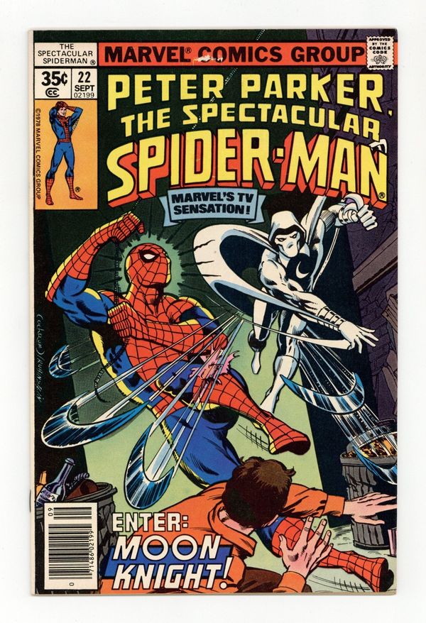 $22.50"By the Light of the Silvery Moon Knight!" Part 1 of 2. Guest-starring Moon Knight. Script by Bill Mantlo. Pencils by Mike Zeck. Inks by Bruce Patterson. Cover by Dave Cockrum and Joe Rubinstein. Moon Knight is waging a one-man war against the Maggia! During a hold-up at a local diner, he receives some unwanted help from the Amazing Spider-Man. Are the two heroes going to fight the Maggia or each other? The Maggia doesn't care, because they've imported a super-villain to beat both of them! Cameo appearances by the White Tiger and the Cyclone. (Note: This issue features the first meeting between Moon Knight and Spider-Man.) 32 pages Cover price $0.35.