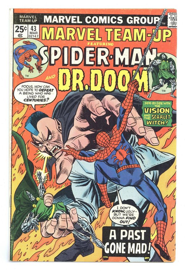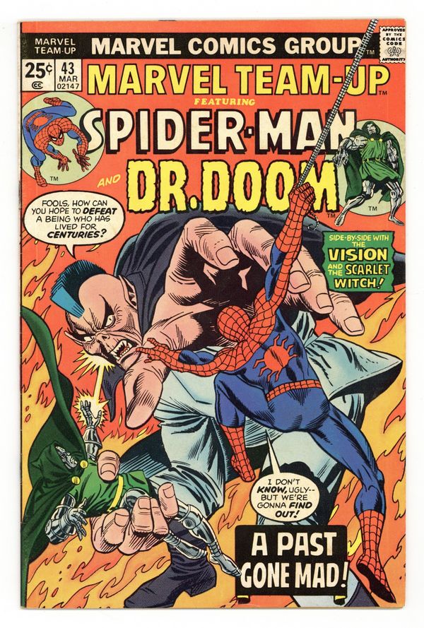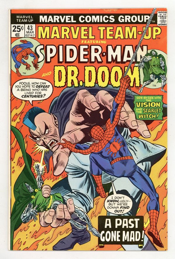 $11.25"A Past Gone Mad!" Part 3 of 4. Guest-starring Spider-Man, Doctor Doom, the Vision, and the Scarlet Witch. Script by Bill Mantlo. Art by Sal Buscema (breakdowns), Mike Esposito (finishes), and Dave Hunt (finishes). Cover by Gil Kane and Frank Giacoia. If the Dark Rider can beat Doctor Doom, the Vision, and the Scarlet Witch, does Spider-man have a chance? Flashback cameo by Reed Richards. (Note: This issue includes a brief retelling of Doctor Doom's origin, as well as a full-page ad for Hostess Cup Cakes featuring Spider-Man vs. Man-Mountain Marko (and guest-starring Mary Jane Watson). The letters page contains a letter from comics publisher Dean Mullaney, and Marvel Value Stamp Series B #46 Captain America.) 36 pages. Cover price $0.25.