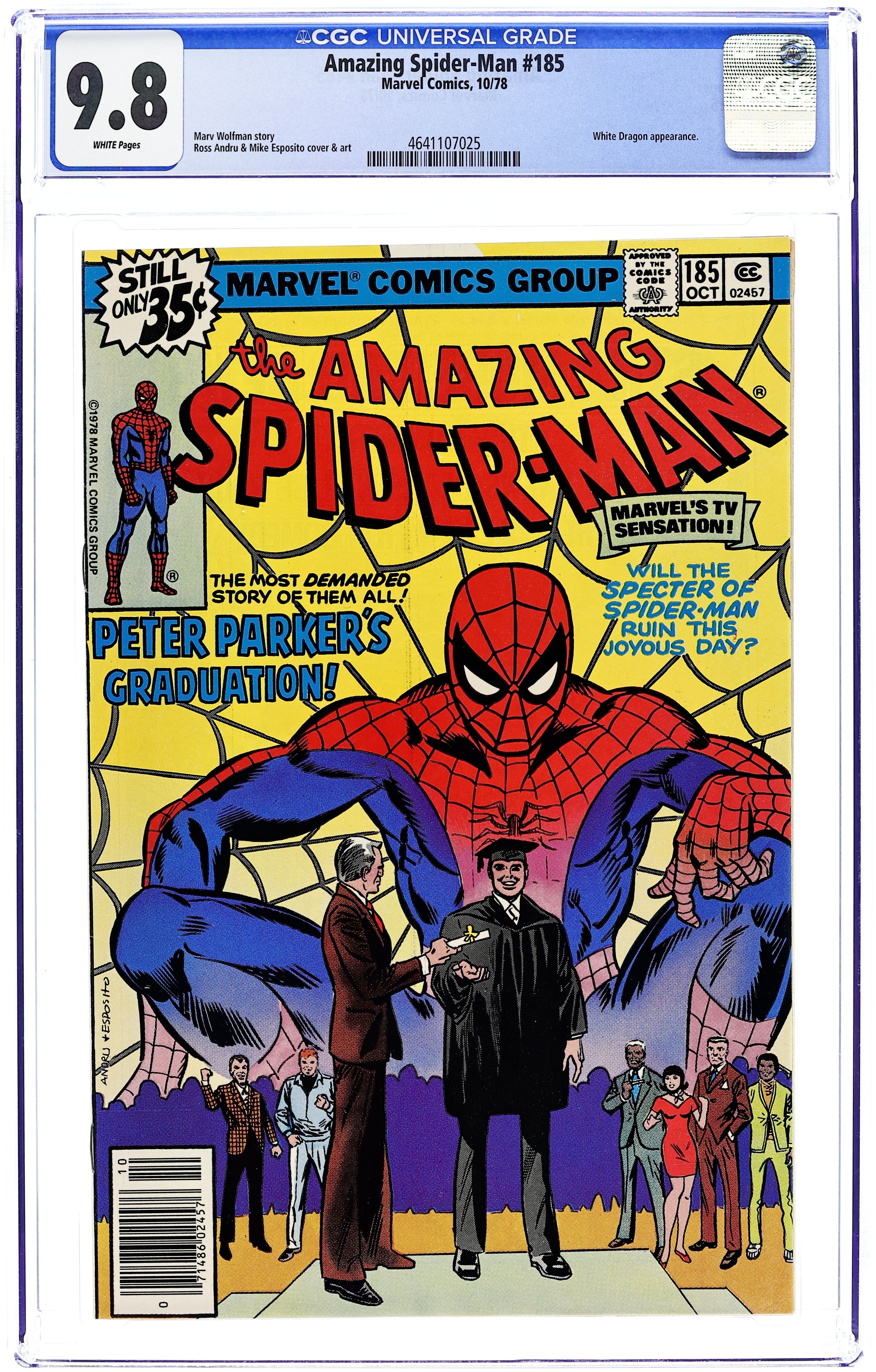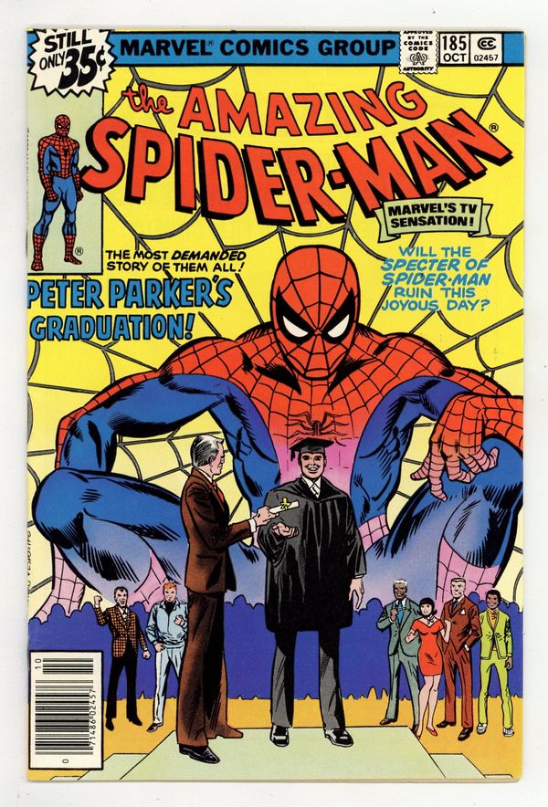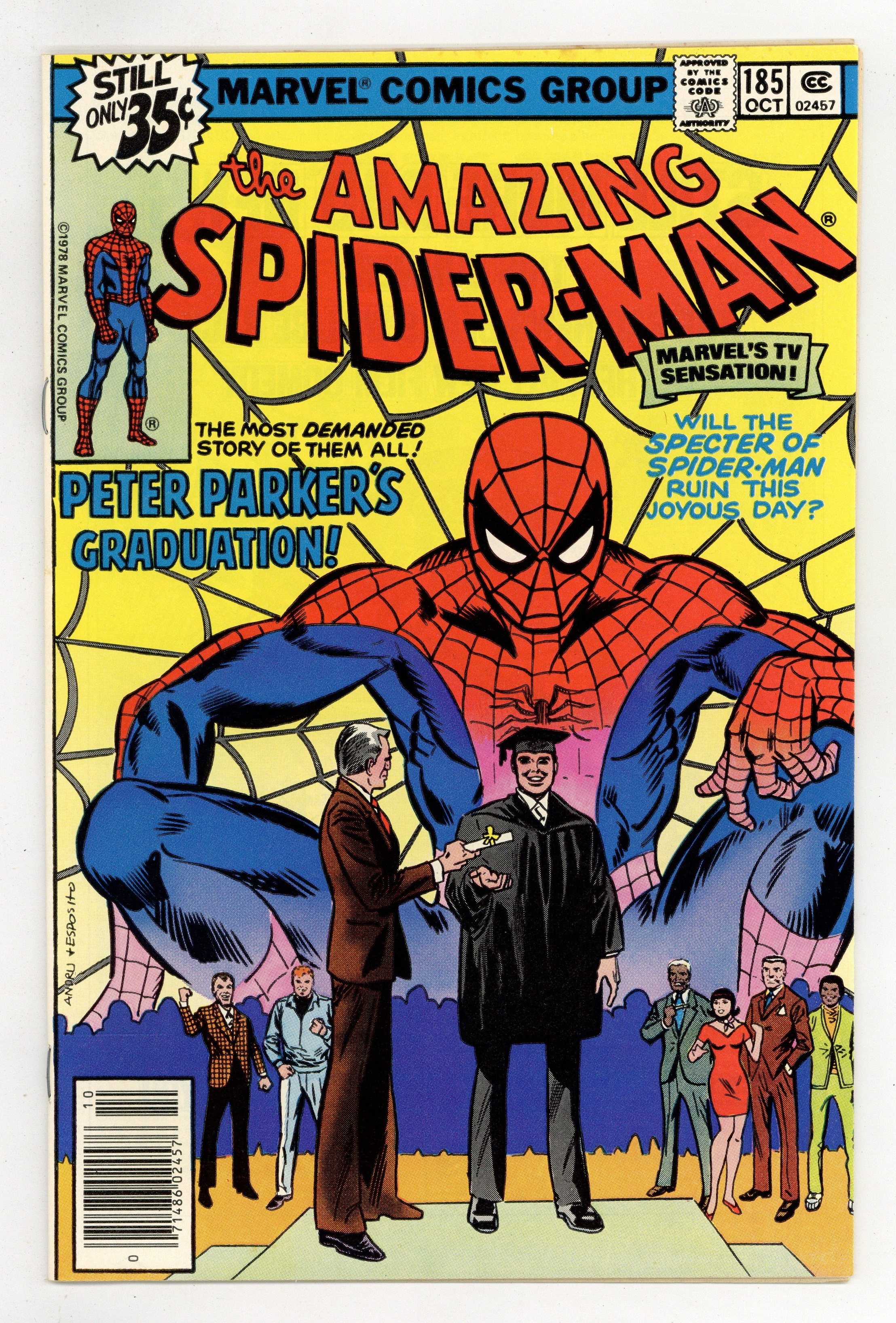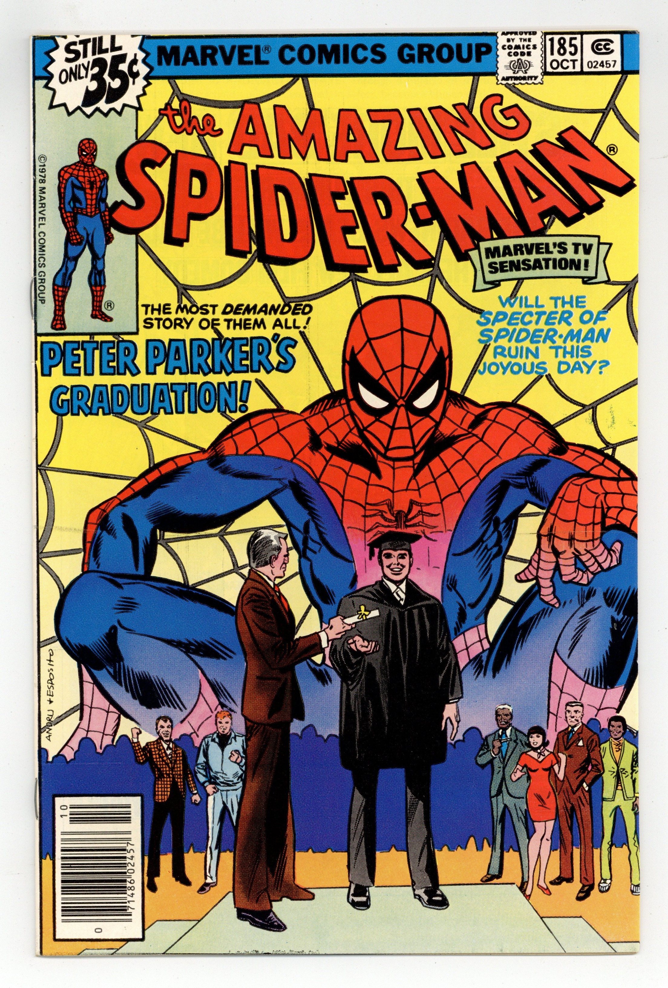 "Spider, Spider, Burning Bright!" Part 2 of 2. Script by Marv Wolfman. Pencils by Ross Andru. Inks by Mike Esposito. Cover by Ross Andru and Mike Esposito. The Spectacular Spider-Man is on fire in Chinatown! And hurtling towards the East River to save his life! Thankfully, the murky waters extinguish the flames and give the wall-crawler a chance to regroup! The following night the web-slinger returns to the Lower East Side to battle the White Dragon again! Will the way of the spider or the way of the (white) dragon prevail? Second story: At long last Peter Parker's graduation day from Empire State University is here! But Peter may want to check one more time with the registrars office...before walking across the stage! Cameo appearances by J. Jonah Jameson, Flash Thompson, Harry Osborn, Betty Brant, Joe Robertson, and Aunt May. (Notes: The White Dragon appears next in Marvel Team-Up 144. This issue concludes Ross Andru's remarkable 5-year run as the penciler of the Amazing Spider-Man series -- highlighted by the original clone saga and the creations of the Punisher, Jackal, and Tarantula.) 36 pages. Cover price $0.35.