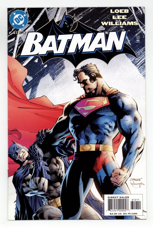 Direct Edition. Story by Jeph Loeb. Art and Cover by Jim Lee and Scott Williams. Guest-starring Superman! Hush, Part 5 of 12. The best-selling comic continues with the fight you've waited for, discussed and argued about: Batman vs. Superman, toe-to-toe! How do you stop the Man of Steel? Who can outwit the World's Greatest Detective? What could bring these uneasy allies to the brink of war? Who will be left standing in a battle that could bring down the city of Metropolis? 36 Pages, Full Color. Cover price $2.25.