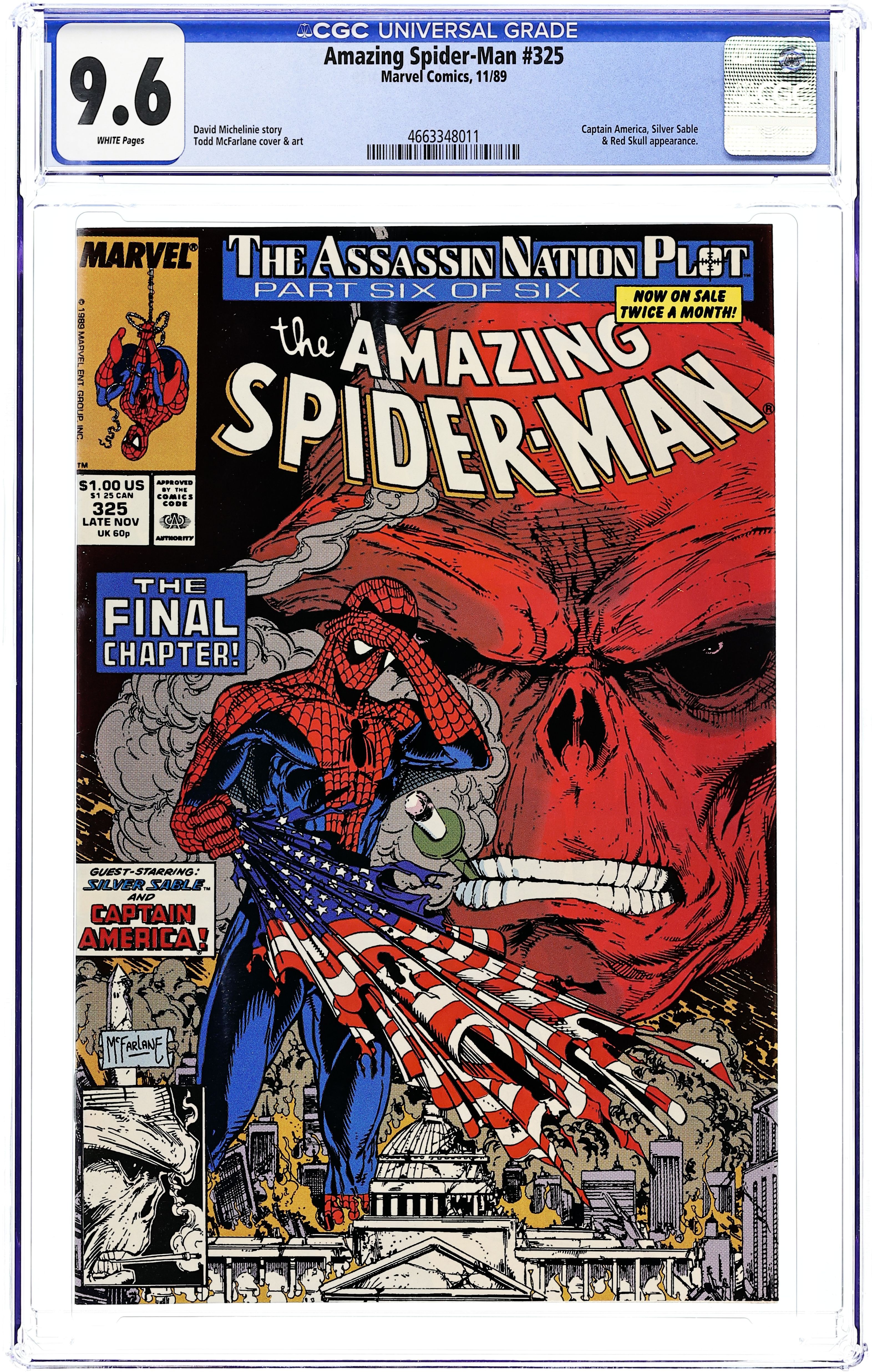 Direct Edition. "Finale in Red!" The Assassin Nation Plot Part 6 of 6. Guest-starring Captain America and Silver Sable. Script by David Michelinie. Art by Todd McFarlane. Cover by Todd McFarlane. As depicted on the dynamic cover, the Red Skull stands revealed as the architect of the Assassin Nation Plot! And in the bowels of the National Archives in our nation's capital, the Amazing Spider-Man comes face-to-face with the former top terror operative of the Third Reich! Wow! The sinister skull wants to burn the U.S. Constitution and the Declaration of Independence! But America's favorite web-slinger can't let that happen! Will the wondrous wall-crawler come through for the red, white, and blue? Cameo appearances by Mary Jane Watson, Ultimatum, the Resistants, and the Watchdogs. 36 pages. Cover price $1.00.