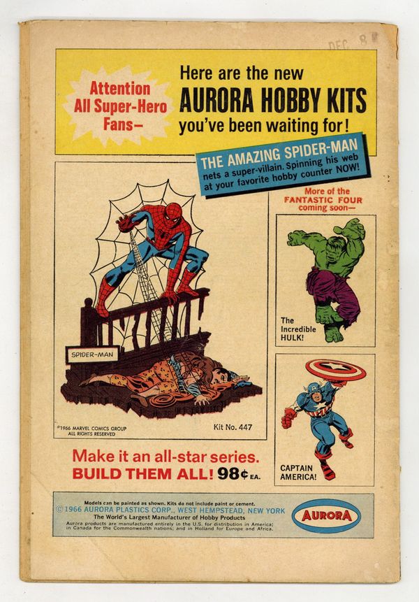 Starts Dec 8 Cover by John Romita Sr.. The third appearance of the Lizard in Spidey Smashes Out!, script by Stan Lee, art by John Romita Sr.; The Lizard heads to Dr. Connor's lab to find a formula to transform reptiles into his personal army; Aunt May worries about Peter; The Lizard and Spider-Man battle aboard a train. Reprinted in Marvel Tales # 185. 36 pgs., full color. $0.12. Cover price $0.12.