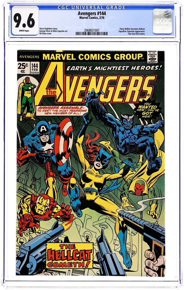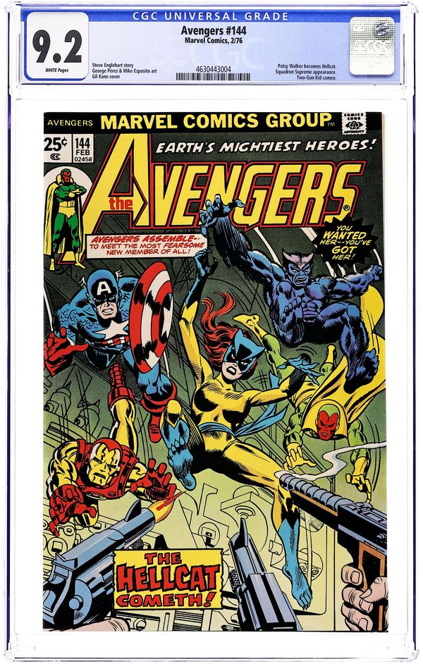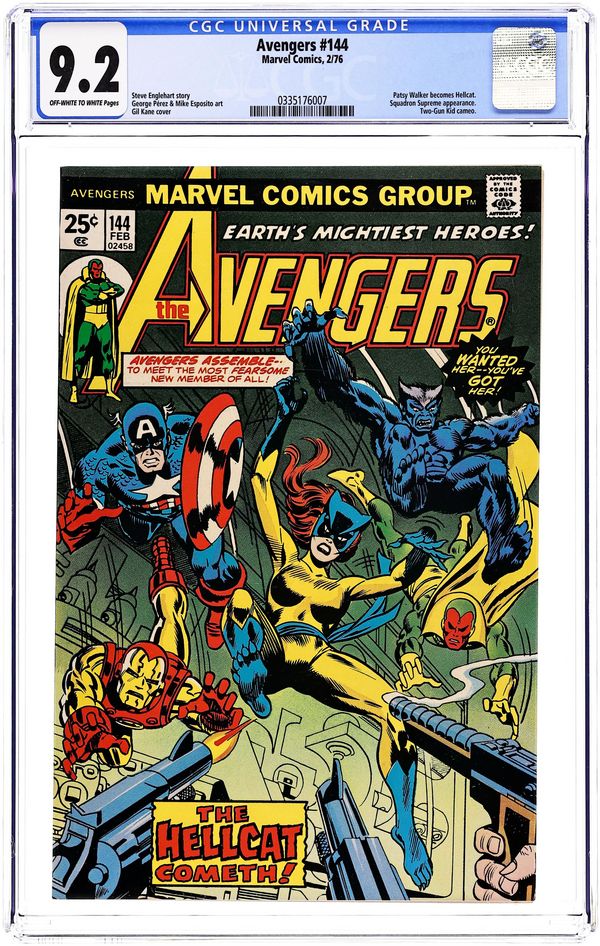 Tags: Marvel Legacy Numbering: Avengers (part 144), Avengers$22.50"Claws!" Part 4 of 7. First appearance of Hellcat. Script by Steve Englehart. Pencils by George Perez. Inks by Mike Esposito. Cover by Gil Kane and Frank Giacoia. The Avengers are free inside the Brand Corporation's Long Island facility! However, it doesn't take long for Hugh Jones and Buzz Baxter to locate them and activate the plant's internal military-grade weapons! During the missile attack, the Avengers are forced to split up. The Beast, Vision, and Scarlet Witch go one way...and Captain America, Iron Man, and Patsy Walker go another! When Shell-head comes across the former uniform of the Cat, the shield-slinger gets an idea! And in a dazzling transformation...Patsy Walker becomes Hellcat! The Avengers could use another hero on their side, because the rematch with Doctor Spectrum, the Golden Archer, Hyperion, Lady Lark, and the Whizzer is coming up fast! An excellent issue! The story (part 5) continues in Avengers 147. Origin of Patsy Walker. Cameo appearances by the Two-Gun Kid, Hawkeye, Moondragon, and Thor. Flashback cameos by the Fantastic Four, Spider-Man, and Tigra. (Notes: The letters page includes letters from comics writer Peter Gillis and comics writer Mary Jo Duffy, respectively. The letters page also contains Marvel Value Stamp Series B #39 Thor by Jack Kirby.) 36 pgs. Cover price $0.25.