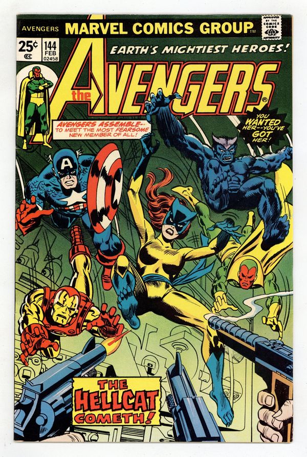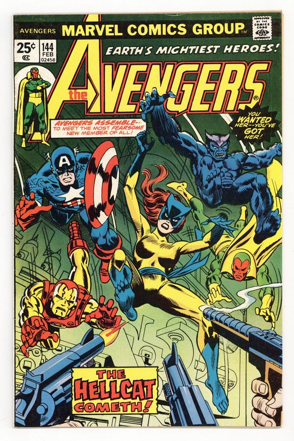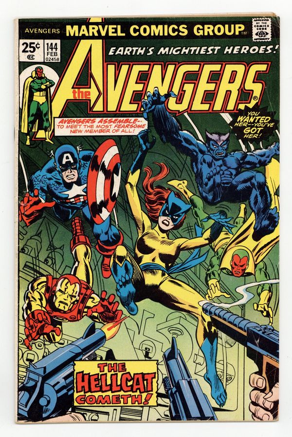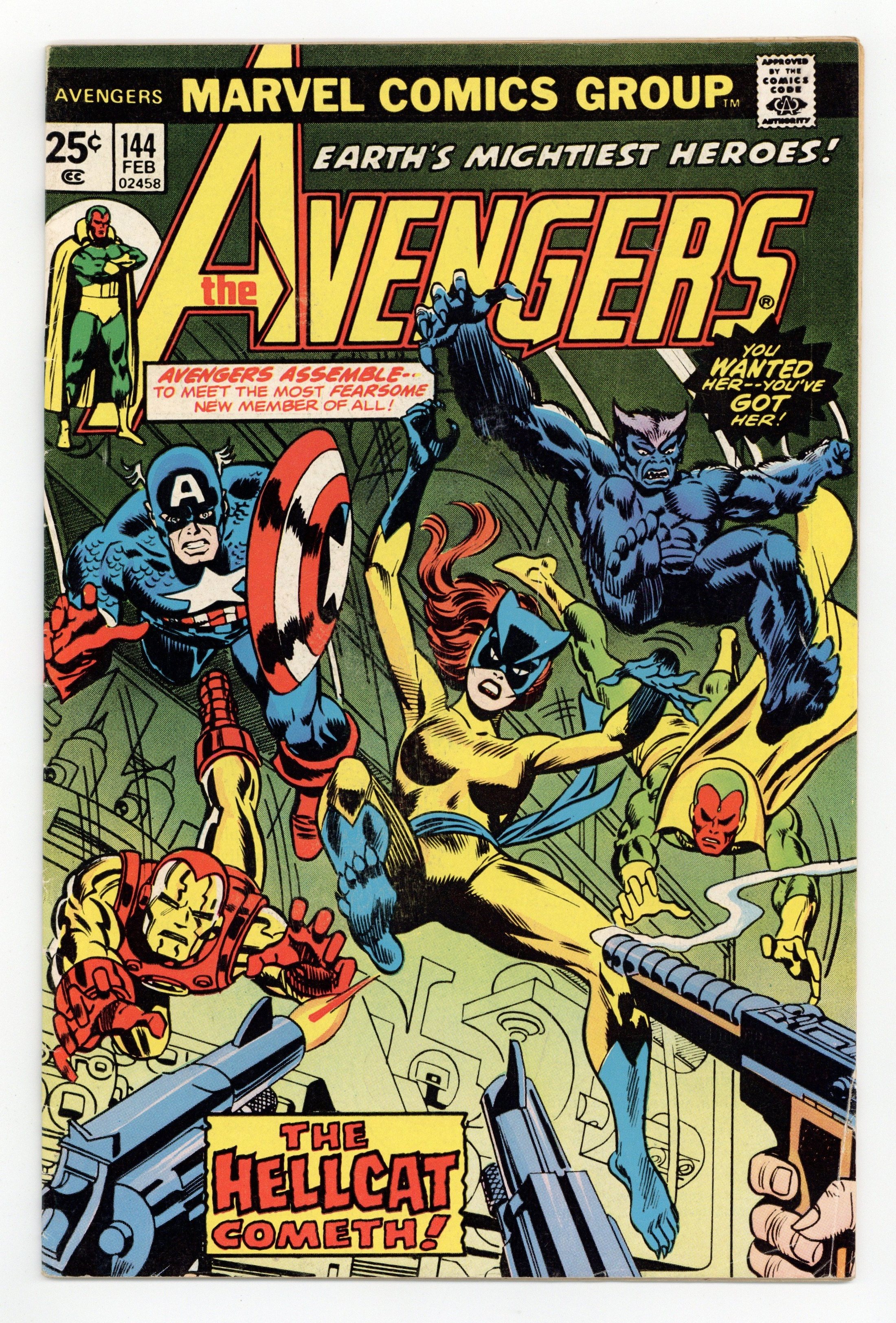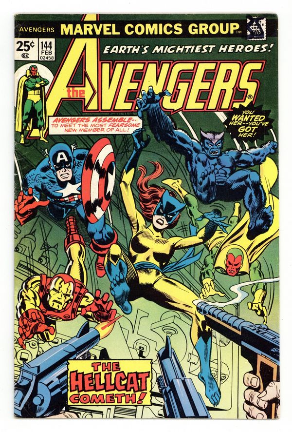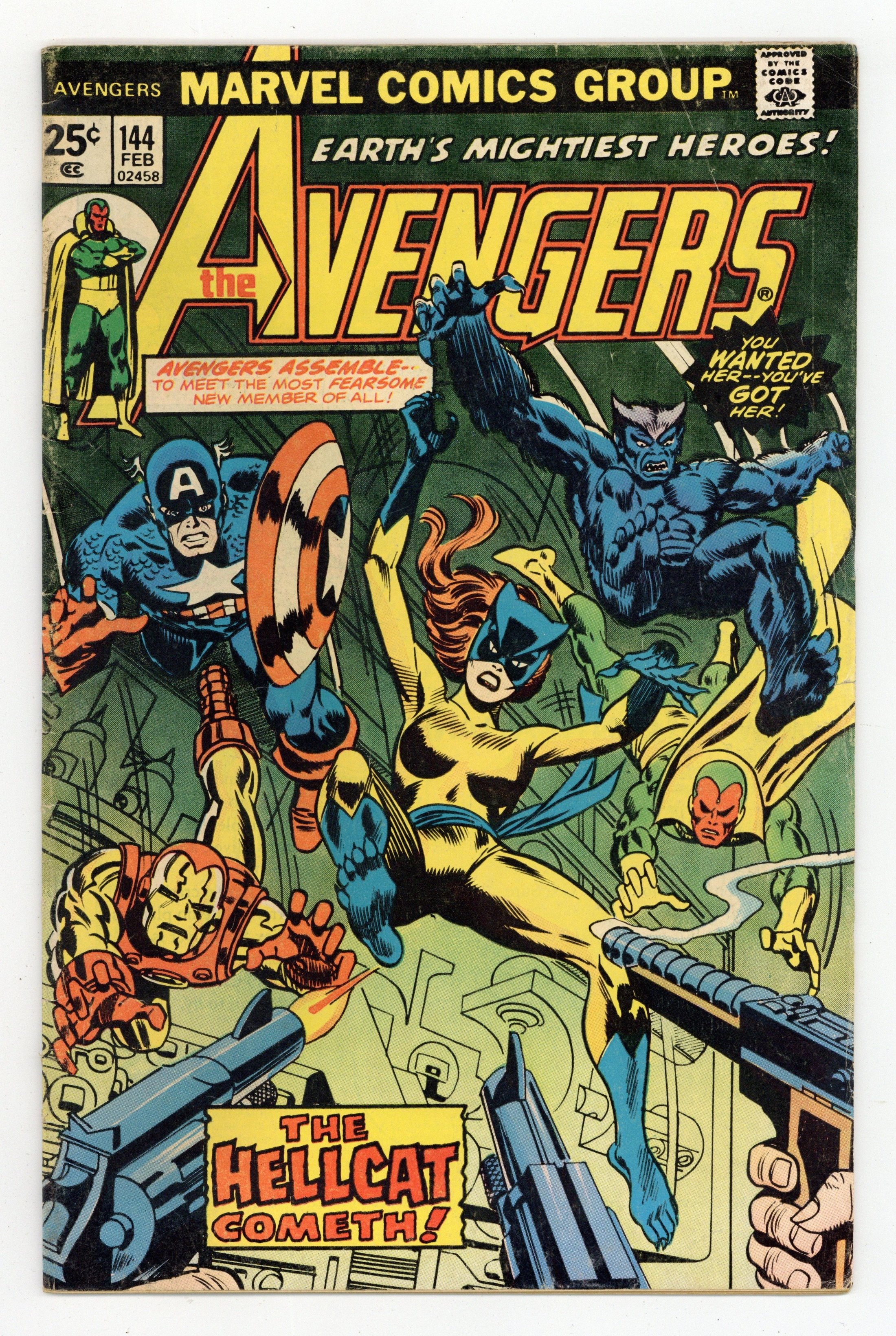"Claws!" Part 4 of 7. First appearance of Hellcat. Script by Steve Englehart. Pencils by George Perez. Inks by Mike Esposito. Cover by Gil Kane and Frank Giacoia. The Avengers are free inside the Brand Corporation's Long Island facility! However, it doesn't take long for Hugh Jones and Buzz Baxter to locate them and activate the plant's internal military-grade weapons! During the missile attack, the Avengers are forced to split up. The Beast, Vision, and Scarlet Witch go one way...and Captain America, Iron Man, and Patsy Walker go another! When Shell-head comes across the former uniform of the Cat, the shield-slinger gets an idea! And in a dazzling transformation...Patsy Walker becomes Hellcat! The Avengers could use another hero on their side, because the rematch with Doctor Spectrum, the Golden Archer, Hyperion, Lady Lark, and the Whizzer is coming up fast! An excellent issue! The story (part 5) continues in Avengers 147. Origin of Patsy Walker. Cameo appearances by the Two-Gun Kid, Hawkeye, Moondragon, and Thor. Flashback cameos by the Fantastic Four, Spider-Man, and Tigra. (Notes: The letters page includes letters from comics writer Peter Gillis and comics writer Mary Jo Duffy, respectively. The letters page also contains Marvel Value Stamp Series B #39 Thor by Jack Kirby.) 36 pgs. Cover price $0.25.