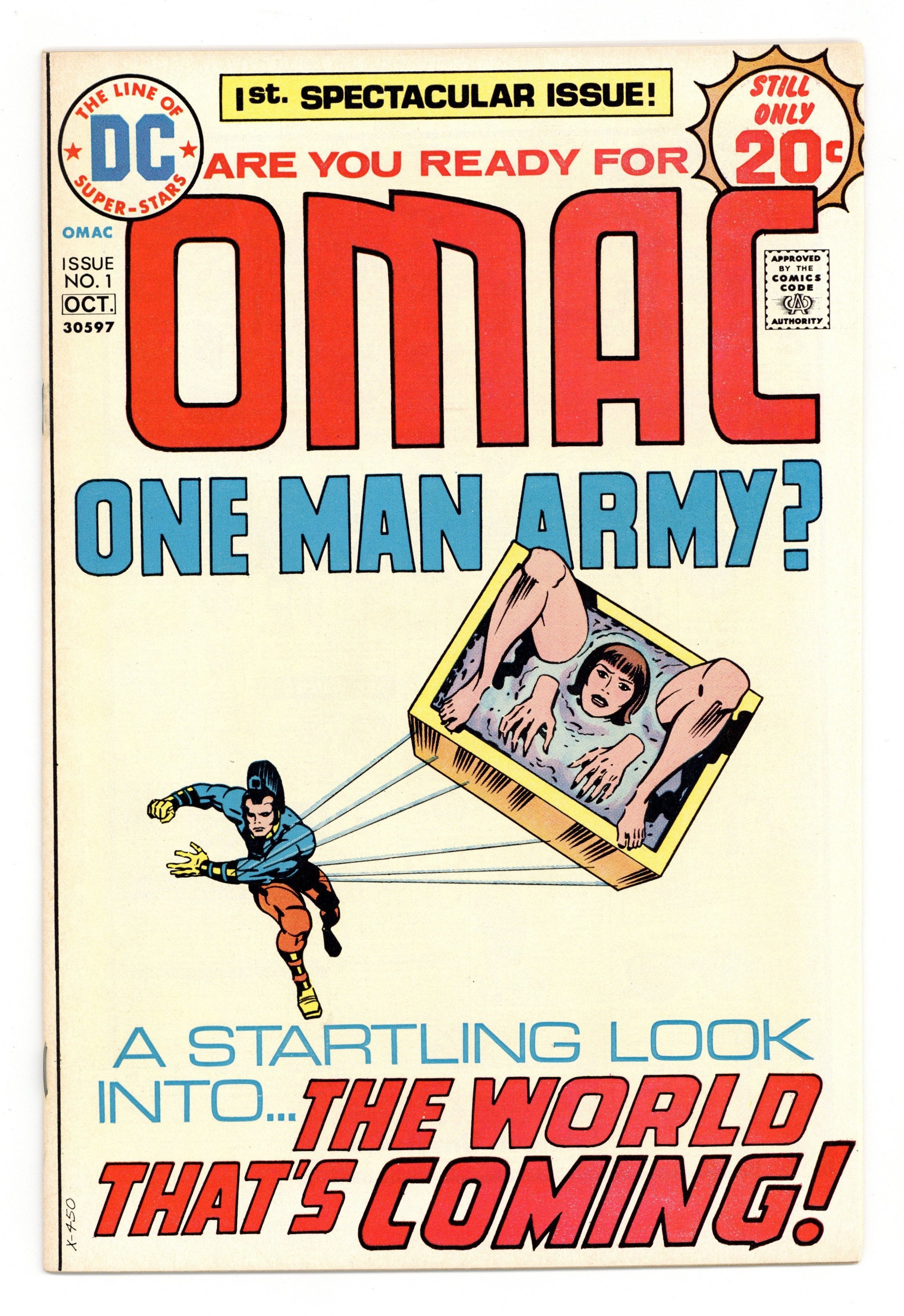 $20.001st appearance and origin of Omac by Jack Kirby in the story, "Brother Eye and Buddy Blank." A transmission from the orbiting Brother Eye turns factory worker Buddy Blank into Omac, the One Man Army Corps. Script and pencils by Jack Kirby, inks by Mike Royer. Cover by Kirby and Royer. Cover price $0.20.