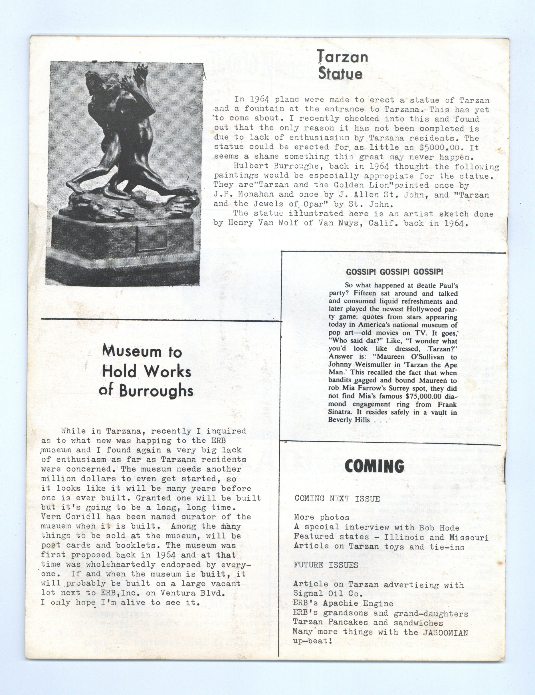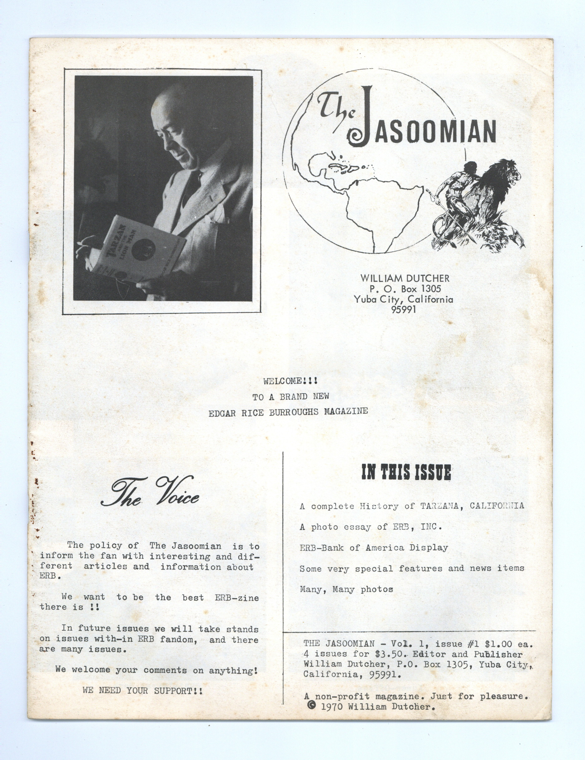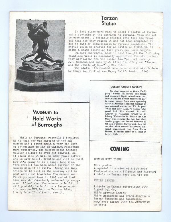 Issue #1 - 1970. Fanzine devoted to celebrating the works of Edgar Rice Burroughs. Articles include a complete history of Tarzana, California, photos from a visit to ERB Inc., news items. Profusely illustrated. 8 1/2-in. x 11-in., 20 pages, black and white. Cover price $1.00.
