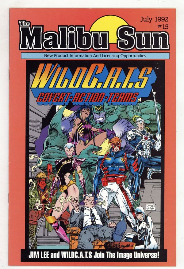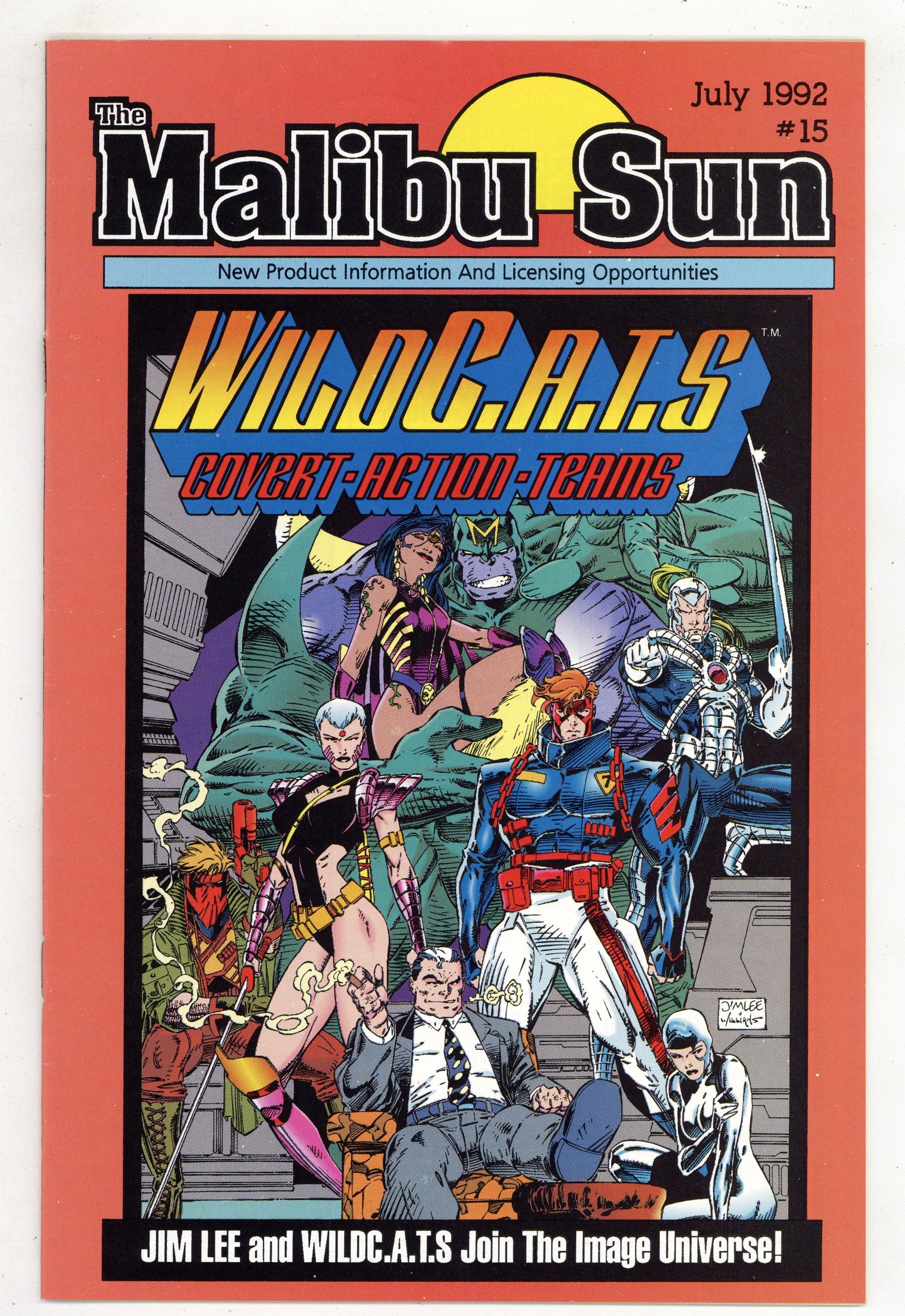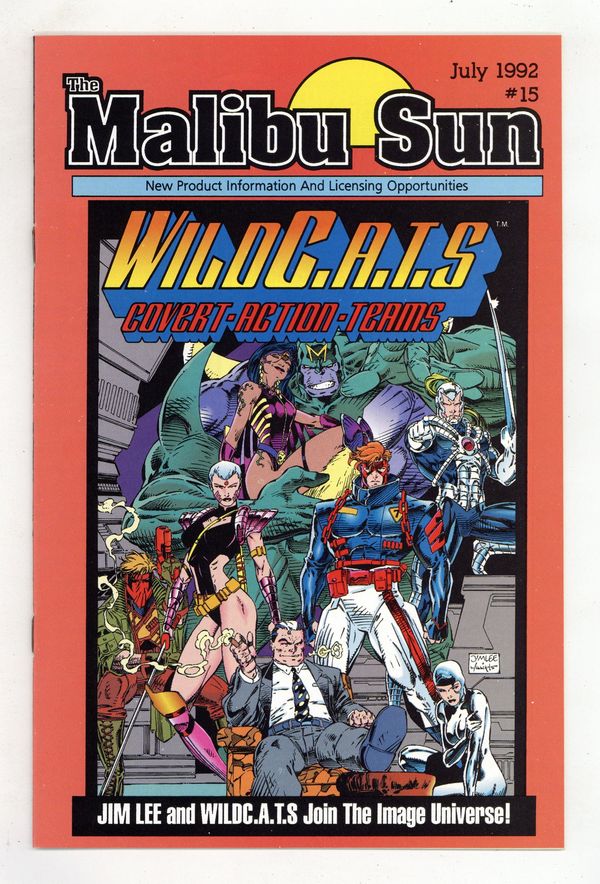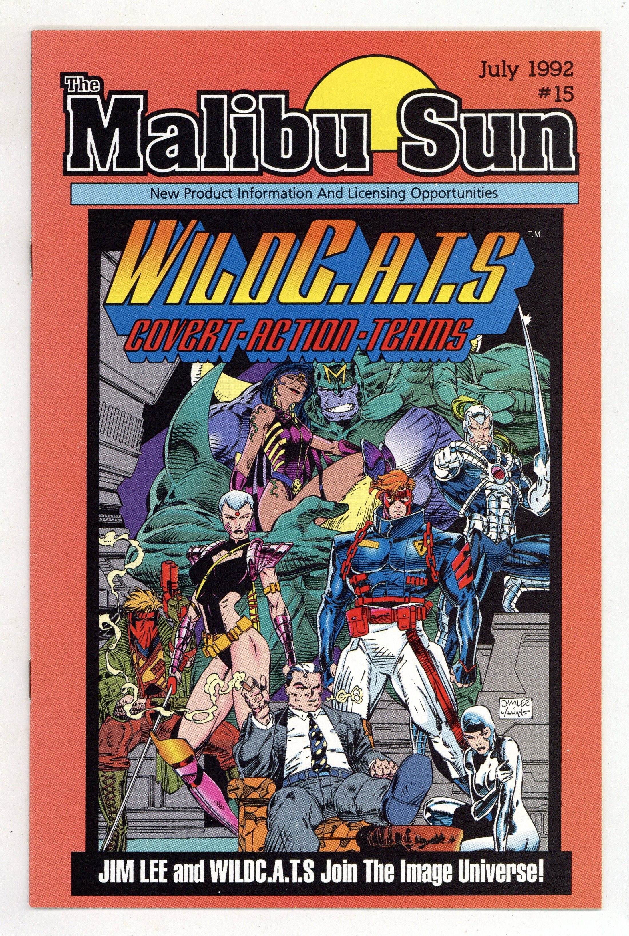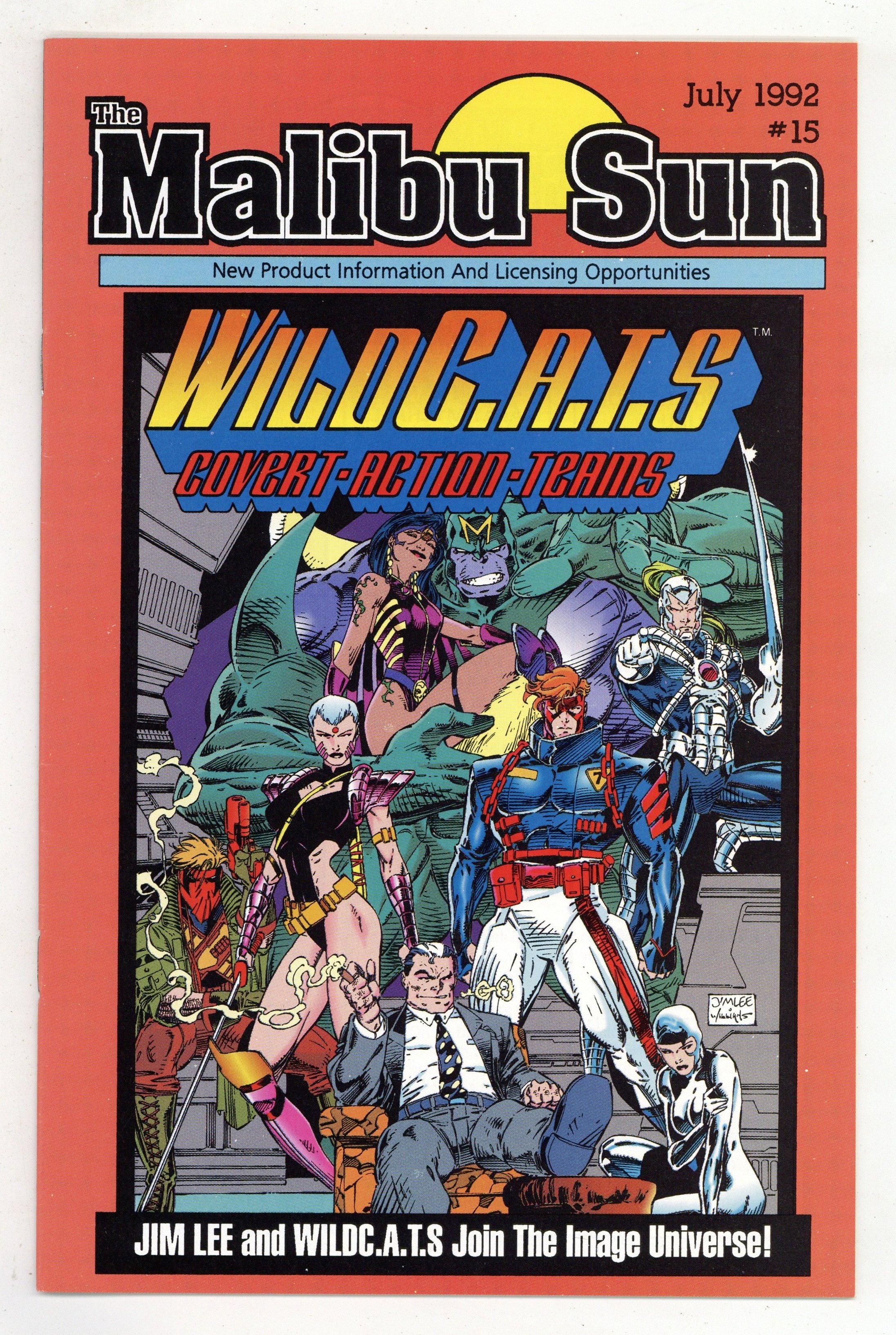 Cover by Jim Lee and Scott Williams. Contents: This Month from Malibu - an introduction to this month's Malibu Sun; Image Comics Titles for July 1992 - Jim Lee's WildC.A.T.s and Liefeld/Kanalz/Mychaels' Brigade debut; Malibu Comics Titles for July 1992; Adventure Comics Titles for July 1992 - featuring Rust Month and The Bat; Platinum Editions Titles for July 1992; Eternity Comics Titles for July 1992; Robert W. Gibson and Tim Eldred talk about the new Captain Harlock project and Robotech; Hank Kanalz and Marat Mychaels chat about their new Image Comics title, Brigade; WildC.A.T.s: Covert Action Teams - Jim Lee's hot new Image Comics title; Image Comics: The Face of the Future by Jim Lee; The World at War; Ask...Doc Malibu.