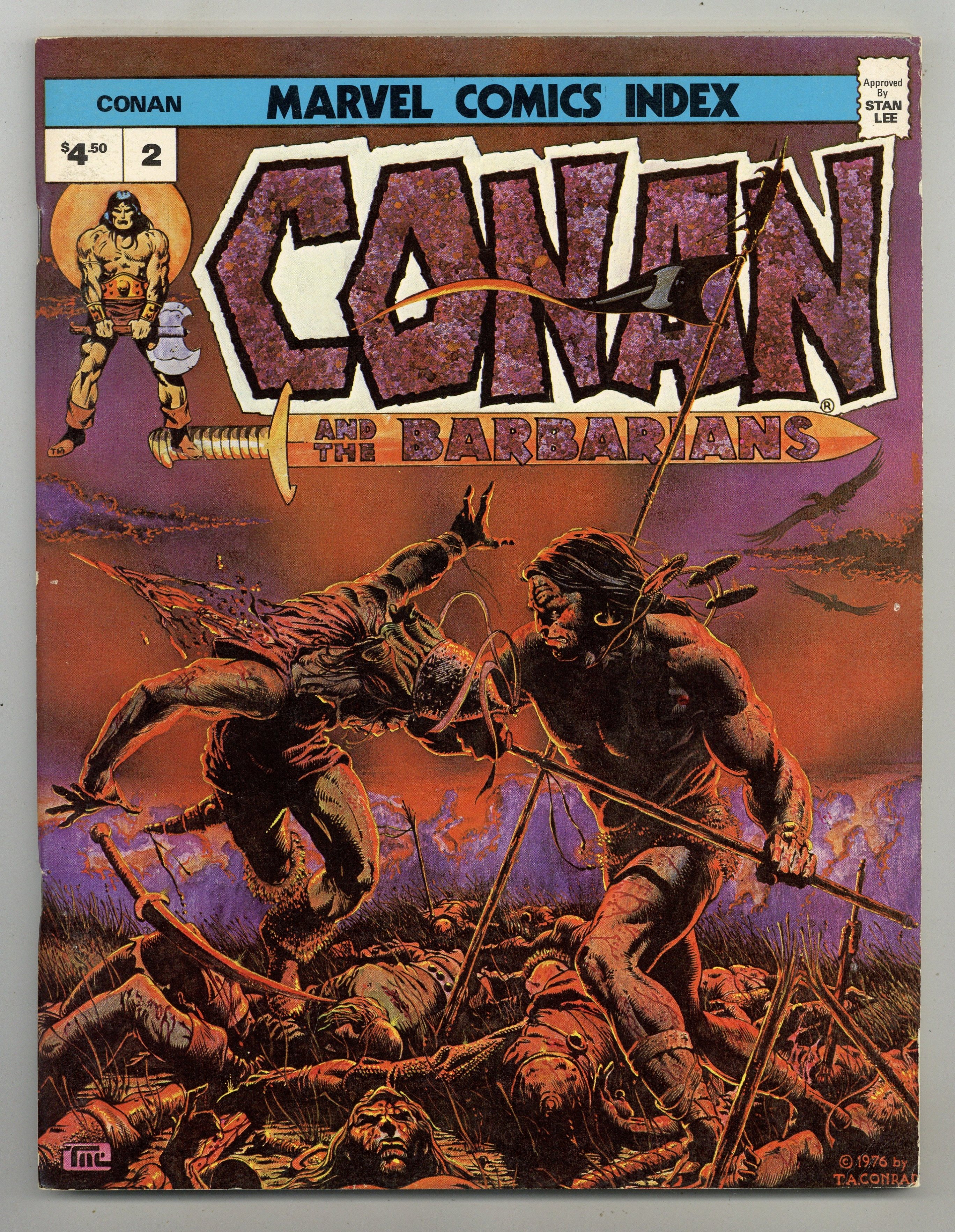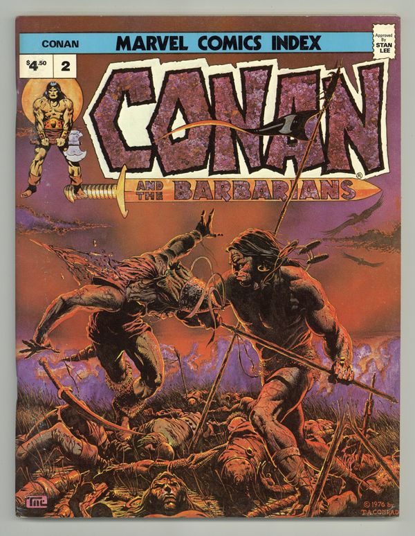 Published Mar 1976 by Pacific Comics.$24.00Magazine series devoted to indexing Marvel Comics Series with synopsis of each title, and info (picture of cover, date, story title, art & writing credits, character appearances and other comments) on each issue of the series. Also Includes a list of crossover appearances. THIS ISSUE covers Conan the Barbarian, Ka-Zar, and King Kull. Tim Conrad cover. Synopsis of Conan The Barbarian, Ka-Zar, and King Kull. Notes on Heroic Fantasy Strips. Conan The Barbarian # 1-61, Annual # 1, Giant Size # 1-5. Savage Sword of Conan # 1-10, Annual # 1. Ka-Zar (1st) # 1-3. Ka-Zar (2nd) # 1-15. Kull the Conqueror # 1-15. Kull and the Barbarians # 1-3. Savage Tales # 11, Annual # 1. Chamber of Chills # 1-21. Chamber of Darkness # 1-8, Special # 1. Monsters on the Prowl # 9-30. Tower of Shadows # 1-9, Annual # 1. Creatures on the Loose # 10-37. Worlds Unknown # 1-8. Personnel & Major Character cross reference indexes. Cover price $4.50.