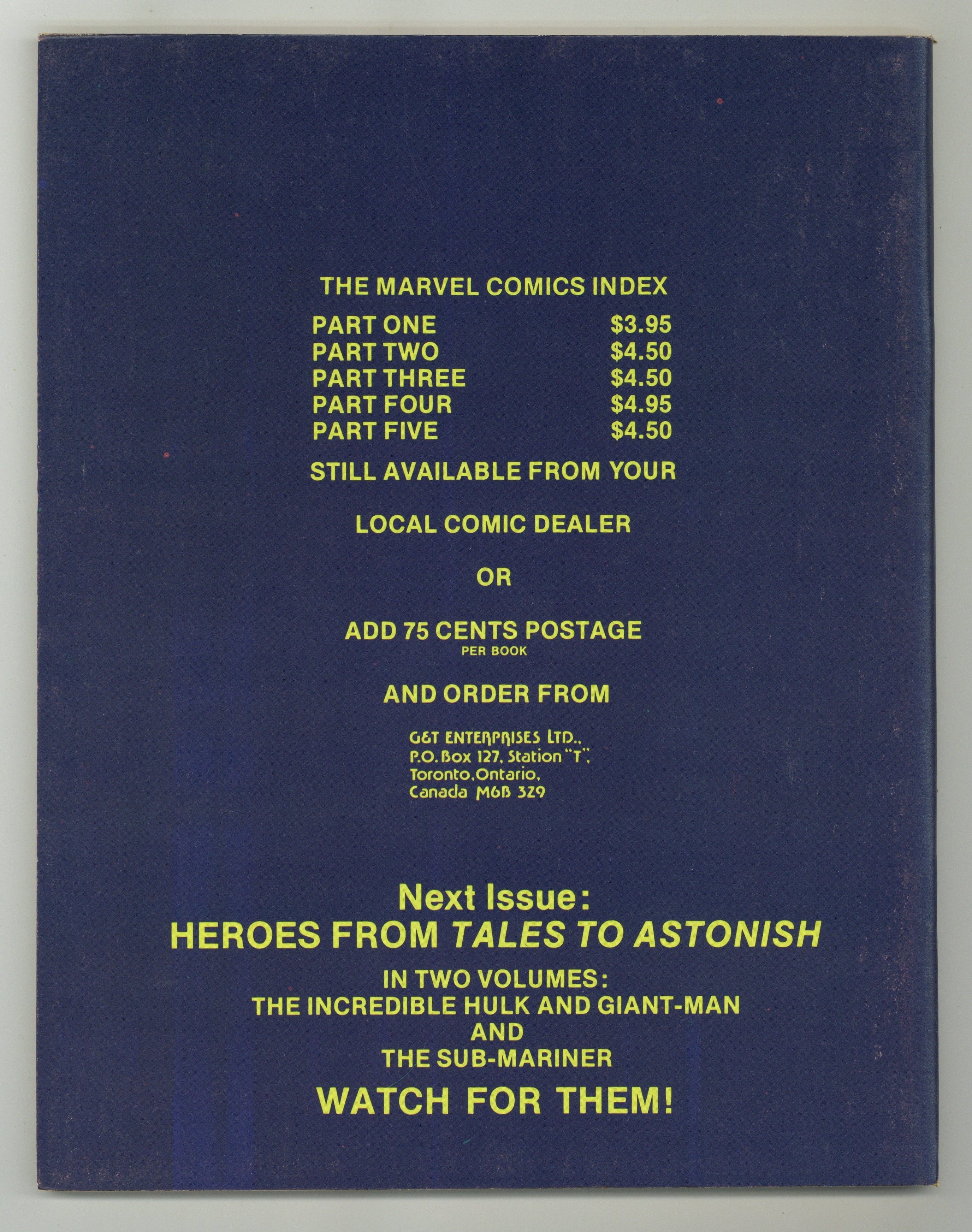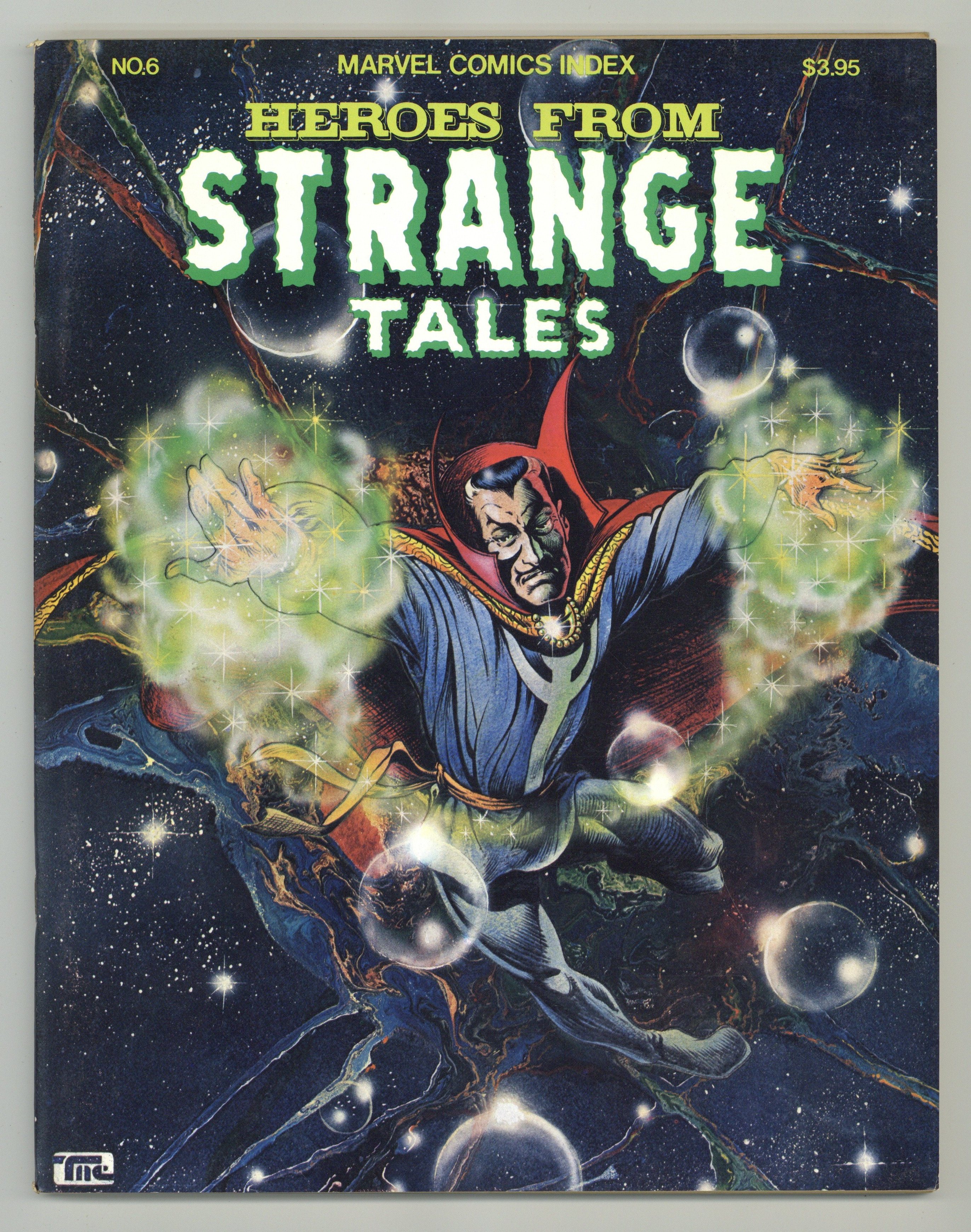 Magazine series devoted to indexing Marvel Comics Series with synopsis of each title, and info (picture of cover, date, story title, art & writing credits, character appearances and other comments) on each issue of the series. Also Includes a list of crossover appearances. THIS ISSUE covers Heroes from Strange Tales. Bill Everett/Dean Motter cover. Synopsis of Doctor Strange. Notes on Strange Tales. Strange Tales # 1,25,74,75,77,79,89,101-188, & Annuals # 1-2. Doctor Strange (1st) # 169-183. (2nd) # 1-27, & annual # 1 & Giant Size # 1. Nick Fury Agent of Shield # 1-18. Shield # 1-5. Warlock # 1-15. Personnel & Major Character cross reference indexes. Cover price $3.95.