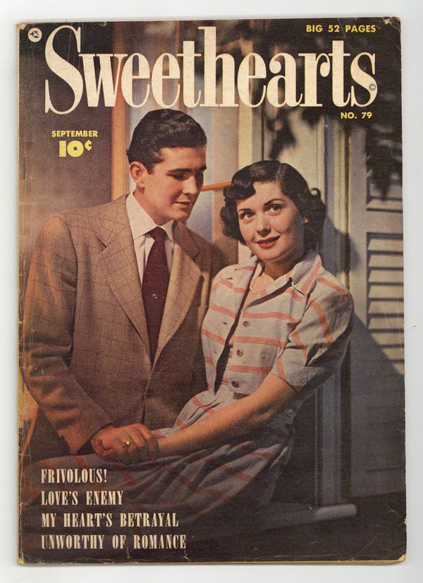 Sweethearts was the first monthly romance title. Sharp-tongued, redheaded Claire is known for her cutting remarks, but when romance blooms, she forgets to put the claws away. Mary and Bob hit it off, but Mary fears that Bob will learn she's the reason why Bob's friend Jeff got dumped by his girlfriend. Phyllis, who demonstrates pianos, meets Harry, a record-company promoter or "song-plugger," in a story that's a little time capsule of the 1940s (pre-rock) music biz. Plus a comics biography of actor Dana Andrews, a romance-themed horoscope, and a romantic story serial. Frivolous!; Loves Enemy; My Hearts Betrayal; Unworthy of Romance; The Happiness and Heartbreak of Vicki Carter; Picture Biography and Dream-Beau of the Month: Dana Andrews. 48 pages, Full Color. Cover price $0.10.