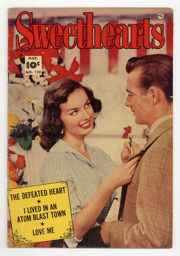 Stories and art by Mike Sekowsky and Daniel Sheldon. Sweethearts was the first monthly romance title. In a real curiosity, even by atomic-comics standards, Janie and Ben's relationship faces an existential crisis when an atom-bomb test outside their small town gives Janie horrifying visions of an atomic holocaust. May and Ted are engaged, but she gets mixed up in underhanded shenanigans at the carnival where she's working, and he gets dragged into her problems. Kate becomes jealous and manipulative of Magda, the beautiful exchange student who's living with her parents for a year. Plus a comics biography of screen legend Elizabeth Taylor. Big Experiment; I Lived in an Atom Blast Town!; Dream Girl of the Month: Elizabeth Taylor; The Defeated Heart; Dream Beau of the Month: Marshall Thompson; Love Me. 32 pages, Full Color. Cover price $0.10.
