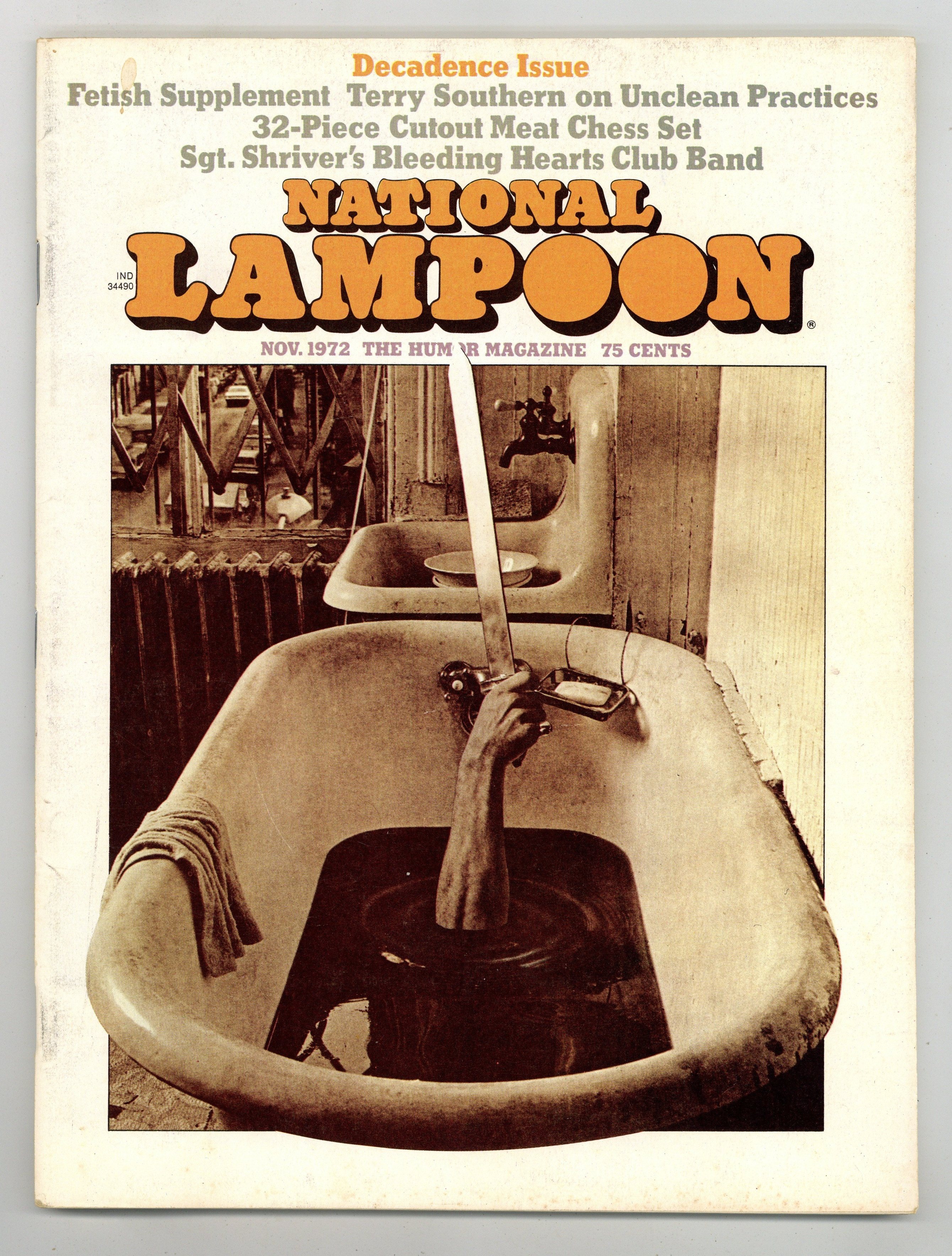 Published Nov 1972 by National Lampoon.$11.00November 1972. Decadance. A spoof of scandal magazines; a story by Terry Southern of Easy Rider fame; the debut of both Dirty Duck by Bobby London and Trots and Bonnie by Shary Flenniken. Stories and art by Michael O'Donoghue, P. J. O'Rourke, Frank Springer, Tony Hendra, Brad Holland, Anne Beatts, Sean Kelly, Gahan Wilson, Jeff Jones, Michael Gross, Henry Beard and Doug Kenney. Plus letters from the editors, cartoons, and Foto Funnies. Mature readers. Cover price $0.75.