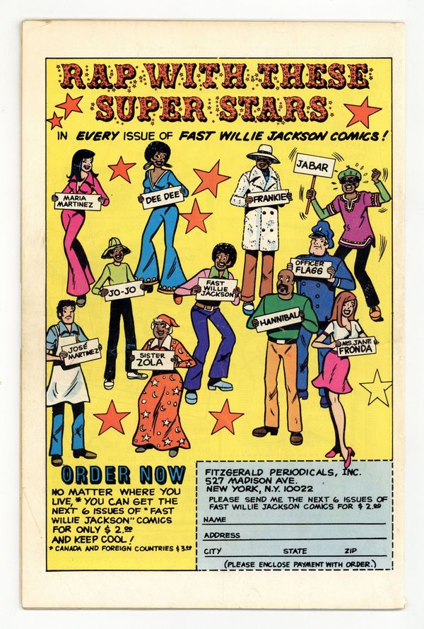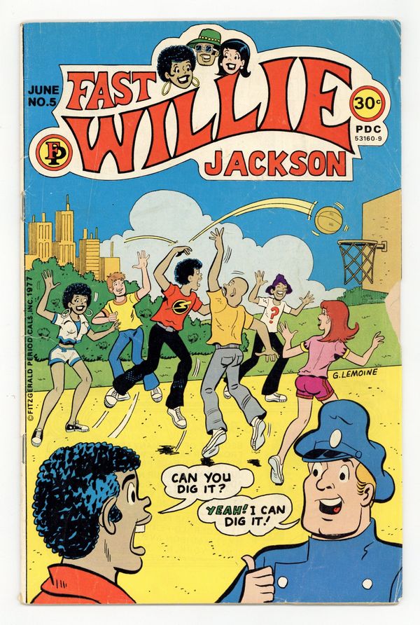 Published Jun 1977 by Fitzgerald Periodicals.$63.00Cover art by G. Lemoine. That's The Spirit, art by Gus Lemoine; Willie wants to get in touch with his dead great-uncle. Now Hear This, art by Gus Lemoine; Willie takes Grandpa to a Jewish diner. The Devil You Say, art by Gus Lemoine; Fast Willie, Jo-Jo and Hannibal get lost in the Louisiana swamps. Tickets Now On Sale, art by Gus Lemoine; José thinks Dee-Dee is too forward with Frankie. Watch The Birdie, art by Gus Lemoine; José is looking after his brother's parrot and it's causing havoc. Fast Willie Jackson ad. 36 pgs. $0.30. Cover price $0.30.