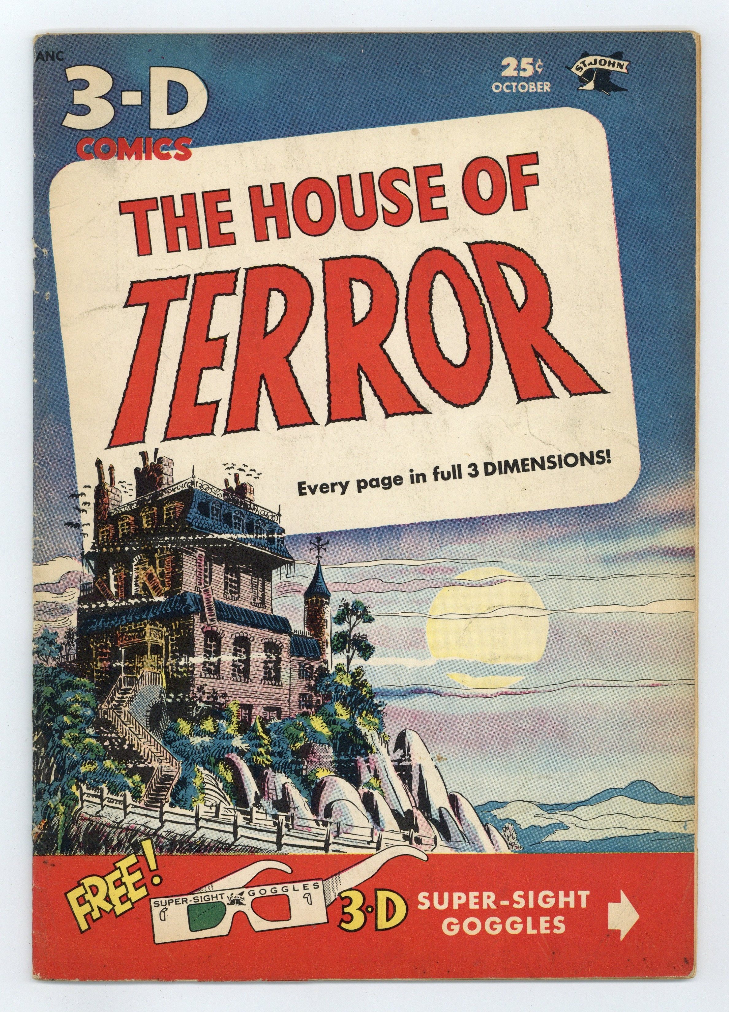 Does not include original 3-D glasses. Cover by Joe Kubert. Stories and art by Joe Kubert, Les Zakarin and Enrico Bagnoli. Pre-Code horror from St. John featuring nice art by comics legend Joe Kubert and Enrico Bagnoli. St. John was a pioneer in 3-D comics during the original 3-D craze of the 1950s. Aspiring painter Henry makes a deal with the devil after he purchases a cursed painting, in a story with early art by comics legend Joe Kubert. In another Kubert story, robbers commit murder while fleeing police, then are pursued by the murdered man's spirit. A violinist falls under the spell of a cursed Stradivarius. Picture of Evil; The Violin of Death; The Curse of Khar; The Devil's Chair. 32 pages, B/W with 3-D effects. Cover price $0.25.
