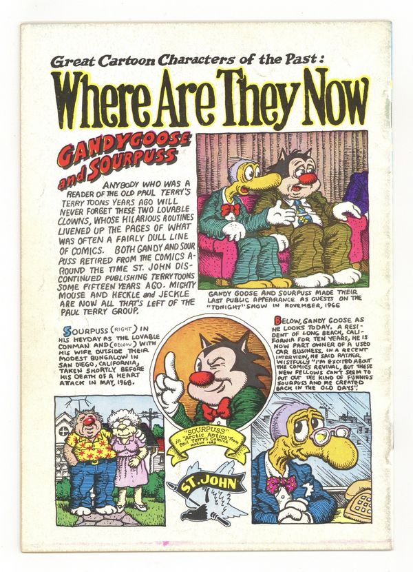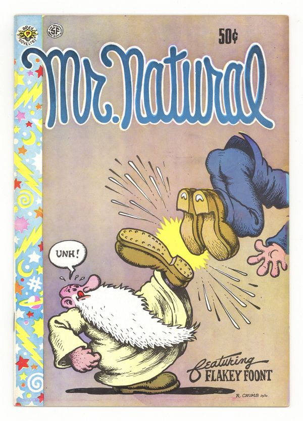MATURE READERS. Cover art by Robert Crumb. "Sunny Side Up"; Mr. Natural sings the lyrics to the popular standard "Keep Your Sunny Side Up!" (by B.G. DeSylva, Lew Brown and Ray Henderson). "Mr. Natural's 719th Meditation"; Mr. Natural meditates while a city rises, collapses and turns to dust. "Om Sweet Om"; Shuman is teased by Mr. Natural to the breaking point while he's meditating on the sidewalk. "The Origins of Mr. Natural." "On the Bum Again"; Mr. Natural, sick of the city, heads out west. While on the train, a lady who asks him to watch her baby never comes back. Gandy Goose and Sourpuss illustration. Scripts and art by Robert Crumb. MATURE READERS. The comix underground's most popular character, Mr. Natural, in his butt-kicking debut issue. 1st printing. To verify first printing, make sure the front cover has a .50 cover price, along with an Apex Novelties AND SF logo, with "R. Crumb 1970" at bottom. The indicia should read "Copyright August 1970 by R. Crumb. Printed by Apex Novelties and published by the San Francisco Comic Book Company." Finally, verify the back cover art is 5 1/2" wide. 28 pgs., B&W. Cover price $0.50.