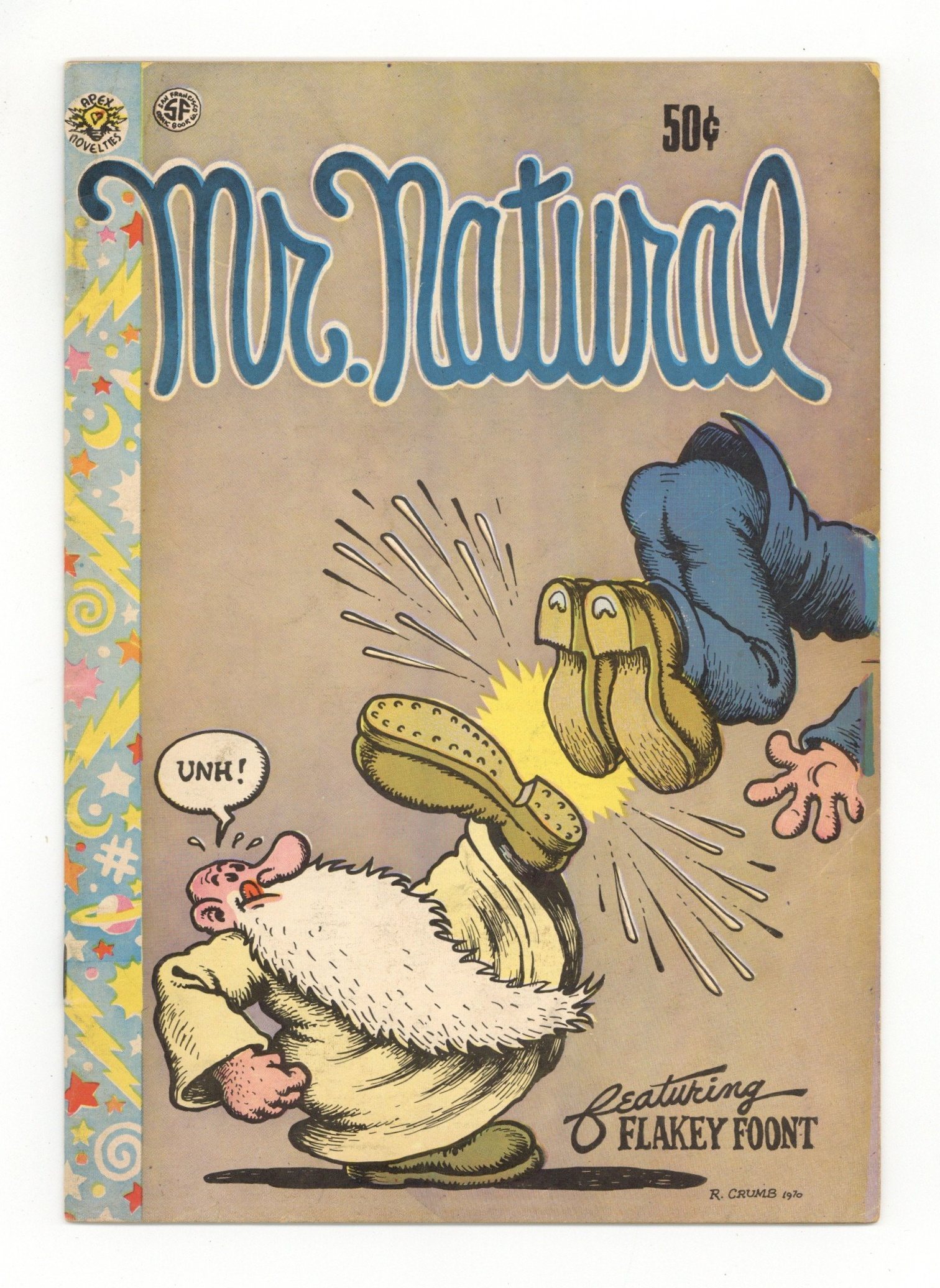 Published 1970 by Apex/Kitchen Sink.$100.00MATURE READERS. Cover art by Robert Crumb. "Sunny Side Up"; Mr. Natural sings the lyrics to the popular standard "Keep Your Sunny Side Up!" (by B.G. DeSylva, Lew Brown and Ray Henderson). "Mr. Natural's 719th Meditation"; Mr. Natural meditates while a city rises, collapses and turns to dust. "Om Sweet Om"; Shuman is teased by Mr. Natural to the breaking point while he's meditating on the sidewalk. "The Origins of Mr. Natural." "On the Bum Again"; Mr. Natural, sick of the city, heads out west. While on the train, a lady who asks him to watch her baby never comes back. Gandy Goose and Sourpuss illustration. Scripts and art by Robert Crumb. MATURE READERS. The comix underground's most popular character, Mr. Natural, in his butt-kicking debut issue. 1st printing. To verify first printing, make sure the front cover has a .50 cover price, along with an Apex Novelties AND SF logo, with "R. Crumb 1970" at bottom. The indicia should read "Copyright August 1970 by R. Crumb. Printed by Apex Novelties and published by the San Francisco Comic Book Company." Finally, verify the back cover art is 5 1/2" wide. 28 pgs., B&W. Cover price $0.50.
