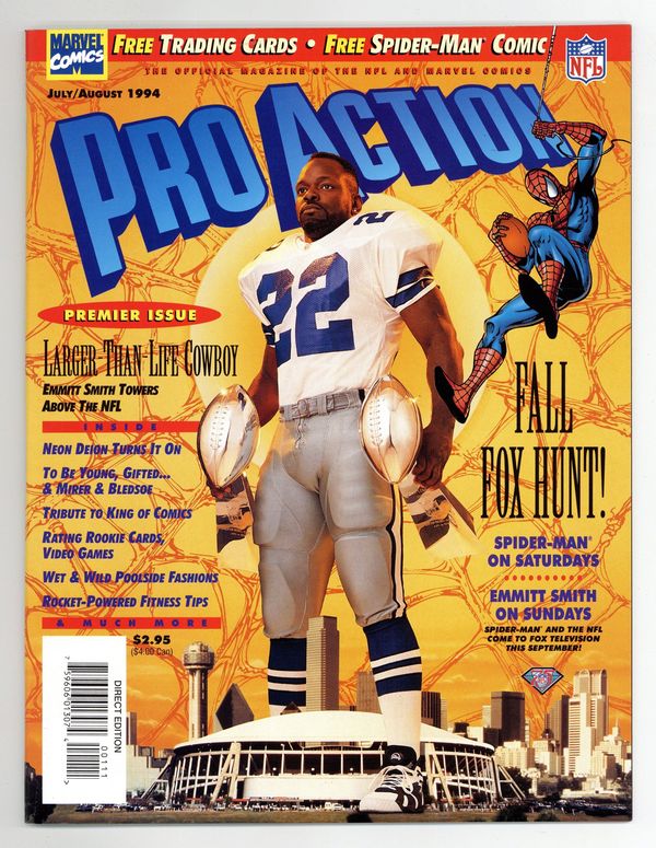 Emmitt Smith cover. Marvel Comics and the NFL team up once again as Pro Action returns as a slick magazine to cover what is sure to be an exciting, watershed year for the NFL as some of the biggest stars of football have either retired, or declared free agency and FOX-TV takes over the broadcasting of NFC games, while Marvel continues to bring you the hottest stars in comics. Opening day delivers the 48-page football spectacular which includes a special Spider-Man comic plus four trading cards! The Amazing Spider-Man: The Goblin Strikes! insert is written by J.M. DeMatteis, with pencils by Alex Saviuk. Cover price $2.95.