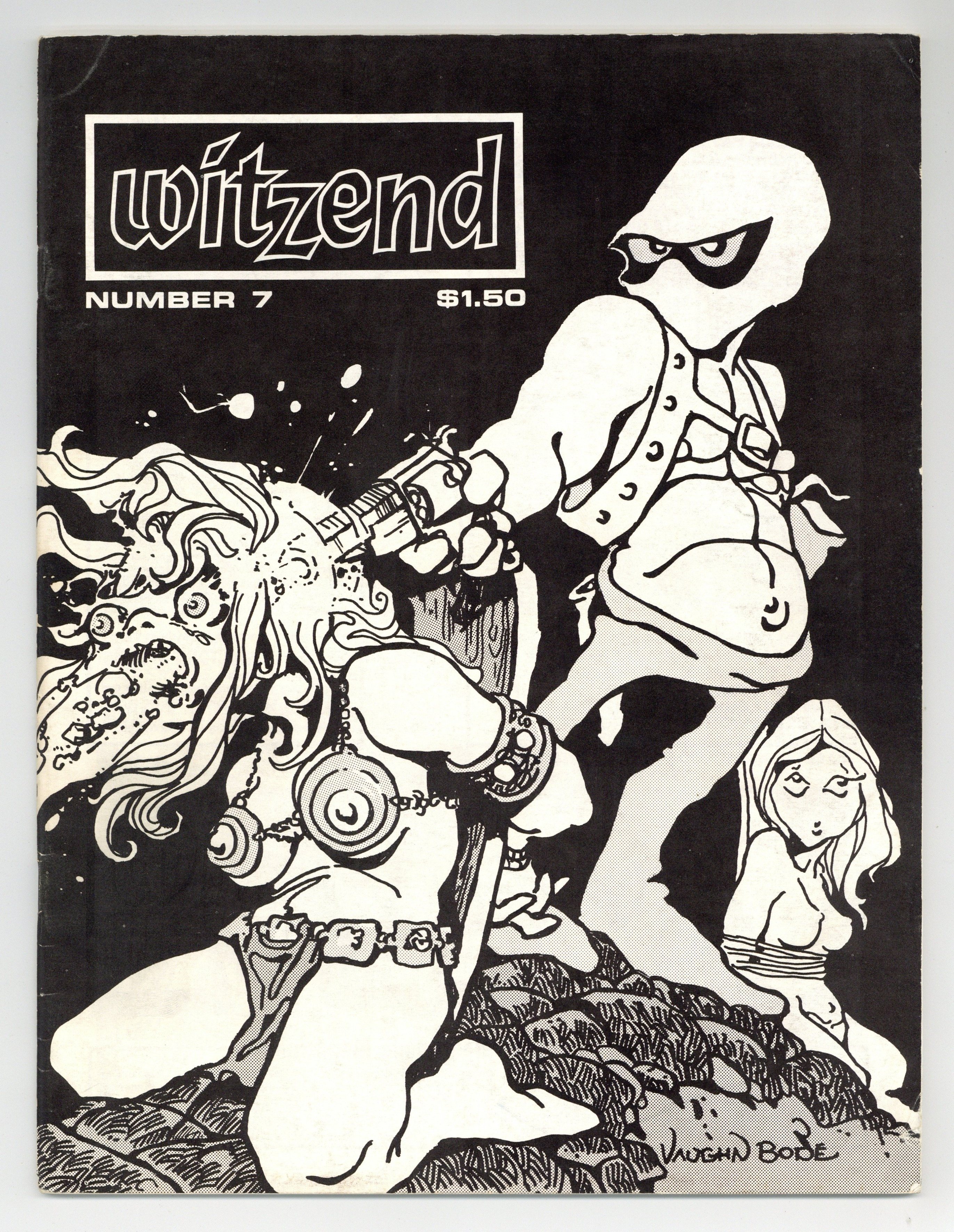 Published by Bill Pearson (with Phil Seuling as associate publisher), Witzend, which was founded by Wallace Wood, is a critically acclaimed fanzine showcasing some of the best artists of the era. Issue #7 includes: Cobalt 60 strip by Vaughn Bode; The Avenging World part 2 strip by Steve Ditko; The Stirring Adventure of Ike and His Spoon strip by Roger Brand; Limpstrel strip by Berni Wrightson; Mister E. Master of Mayhem strip by Ditko; The Journey strip by Betty and Gray Morrow; and more. Cover art by Bode. Back cover art by Kenneth Smith. 44 pgs. Spring, 1970. $1.50 cover price. Cover price $1.50.
