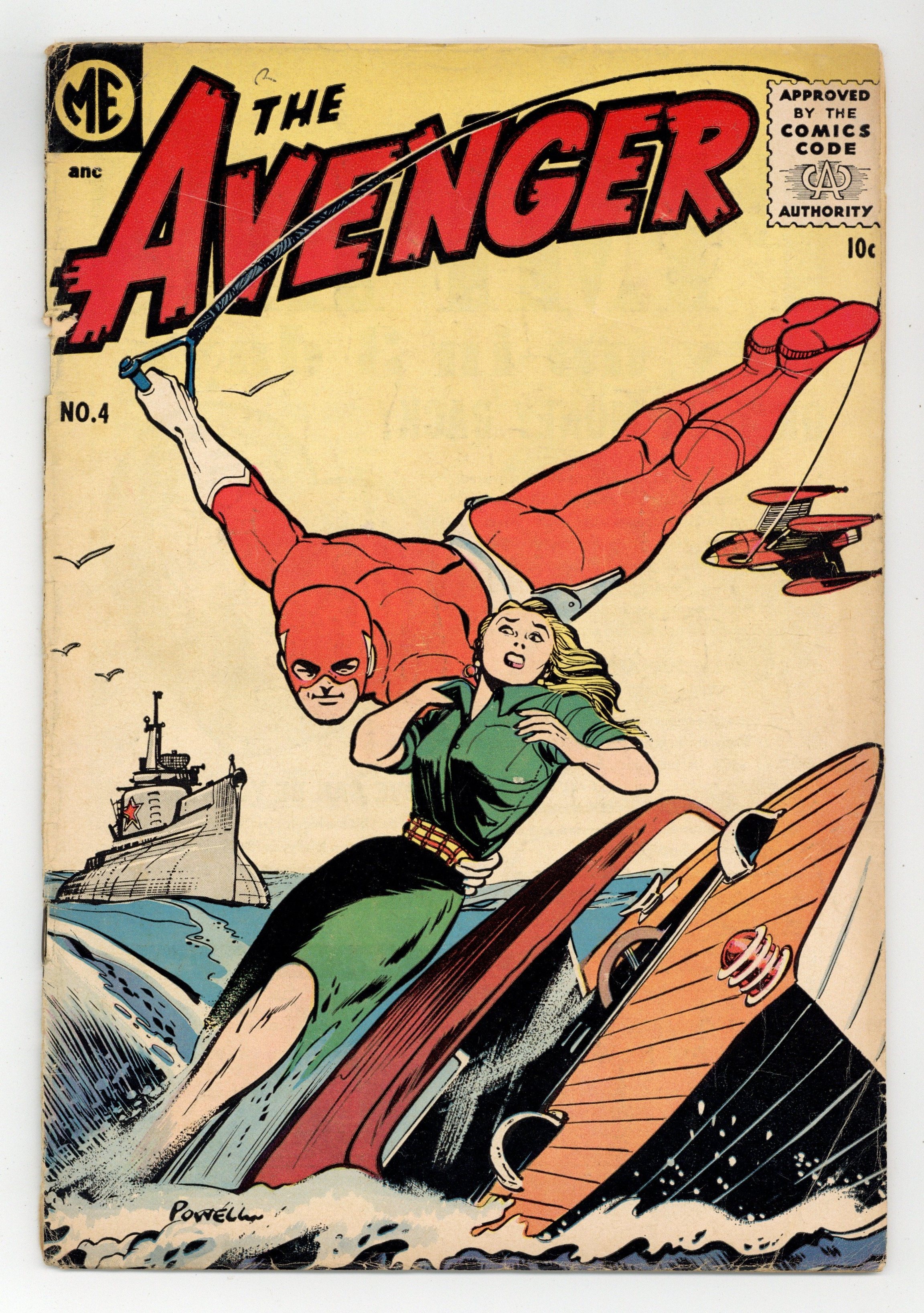 Cover by Bob Powell. Art by Bob Powell. Sometimes listed as A1 Comics (1944 Life's Romances) #138. Scientist Roger Wright uses his inventions, including an aircraft called the Starjet, to battle tyranny as The Avenger. No relation to the pulp-era hero Richard Benson. The Avenger rescues a woman stranded at sea, but it's part of a plot to steal his own tech secrets; The Avenger is trapped by The Player, who tries to kill him with giant games, similar to the X-Men villain Arcade; Factual illustrated articles about missiles, subs and jet engines of the era, as well as the prototype "flying fan". Stories possibly by comics legend Gardner Fox. The Invader from the Sea; Nike: The Ground-to-Air Missile; The Playtime Perils!; Flying Fans; Storm Signals; Treasure Hunting Sub; The Man Who Played Spy; The Jet Engine. Final issue of the series. 32 pages, Full Color. Cover price $0.10.