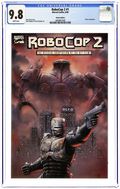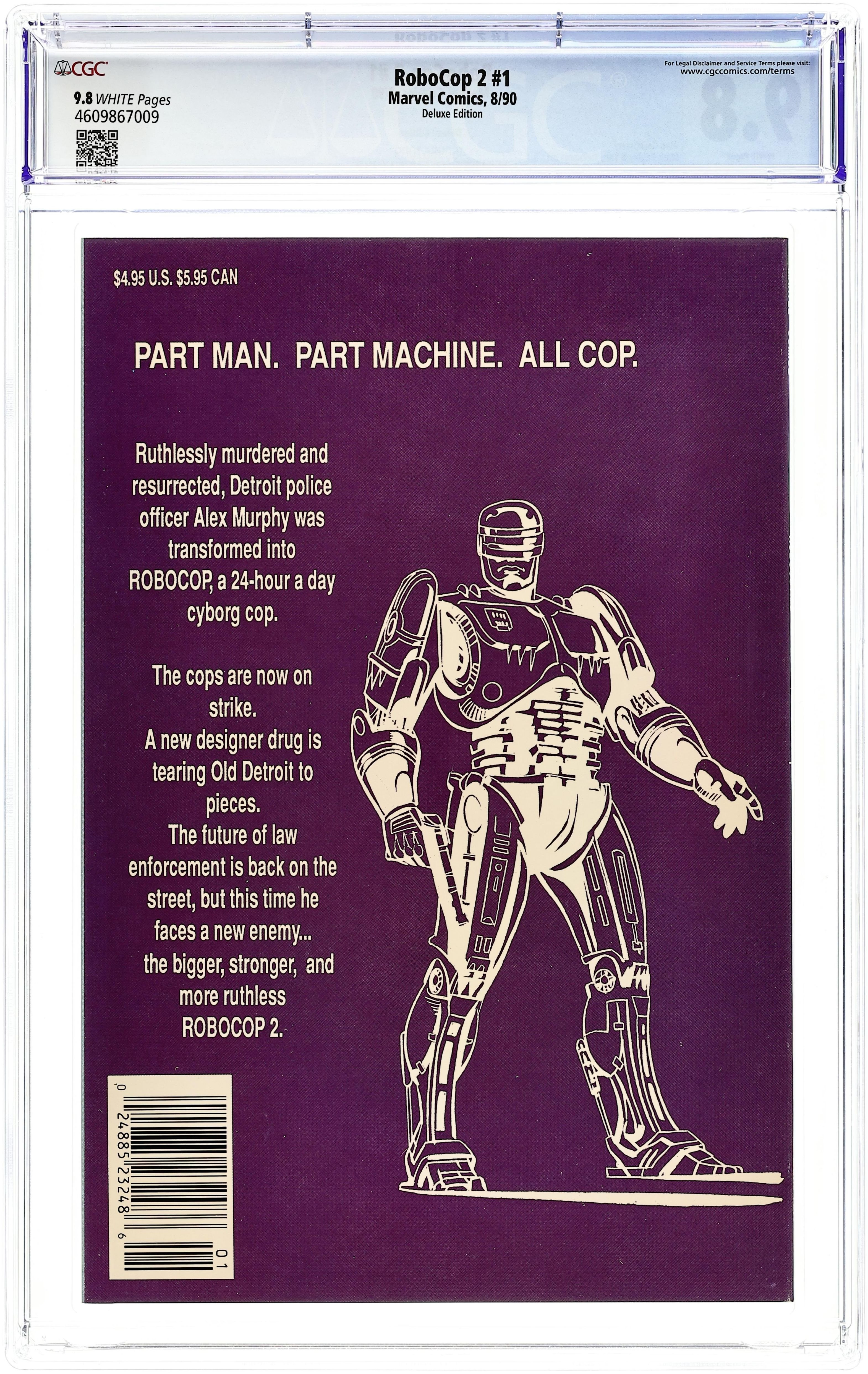 Deluxe format comic sized version, in color, of the official Marvel adaptation of the hit film! Written by Alan Grant (adaptation), Frank Miller (screenplay) and Walon Green (screenplay). Art by Mark Bagley and Tony DeZuniga. Painted Cover by John Rheaume. The cops are on strike. A new designer drug is tearing Old Detroit to pieces. The future of law enforcement is back on the beat. Part man, part machine, all cop! (Also see Robocop 2 (1990 Magazine) #1, which is in B&W, and Robocop 2 (1990 Marvel) #1-3, which are in color; all these adaptations of the film were released at the same time.) Softcover, 64 pages, full color. Cover price $4.95.