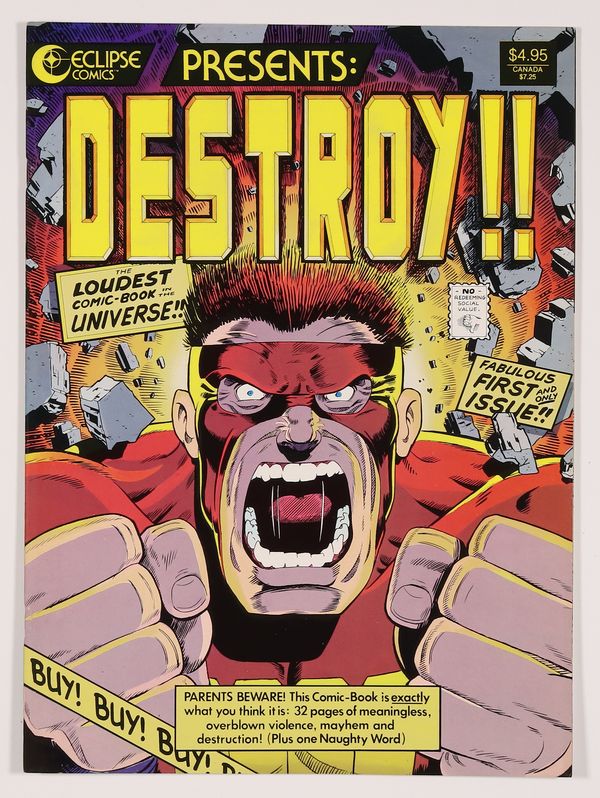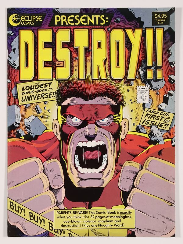 $15.00One-shot written and drawn by Scott McCloud (Zot!, Understanding Comics). DESTROY!! is a parody of superhero comics, a tribute to the big action panels of Jack Kirby, and a forerunner of the "meaningless, overblown violence, mayhem and destruction" that defined the 1990s Image-era of comics. 11 in. x 15 in.; black and white; 32 pages. Cover price $4.95.