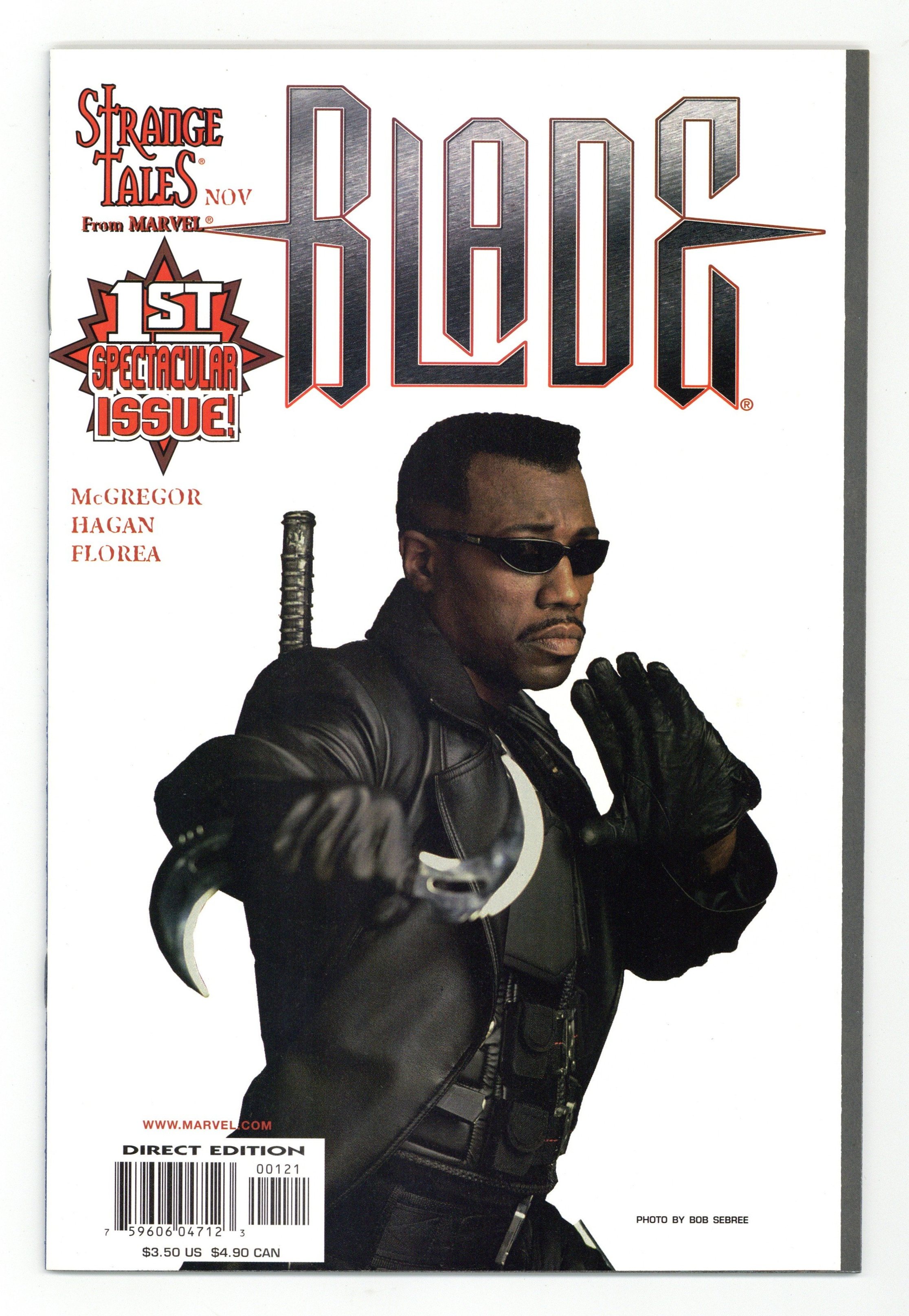 Deadly debut issue! At the moment a vampire killed his mother, Blade was born! Now, armed with unique powers and an array of razor-sharp weapons, he stalks the night to eliminate the vampire plague that has descended upon humanity! Written by Don McGregor. Art by Brian Hagan and Sandu Florea. #1B movie photo cover of Wesley Snipes as Blade. Cover price $3.50.