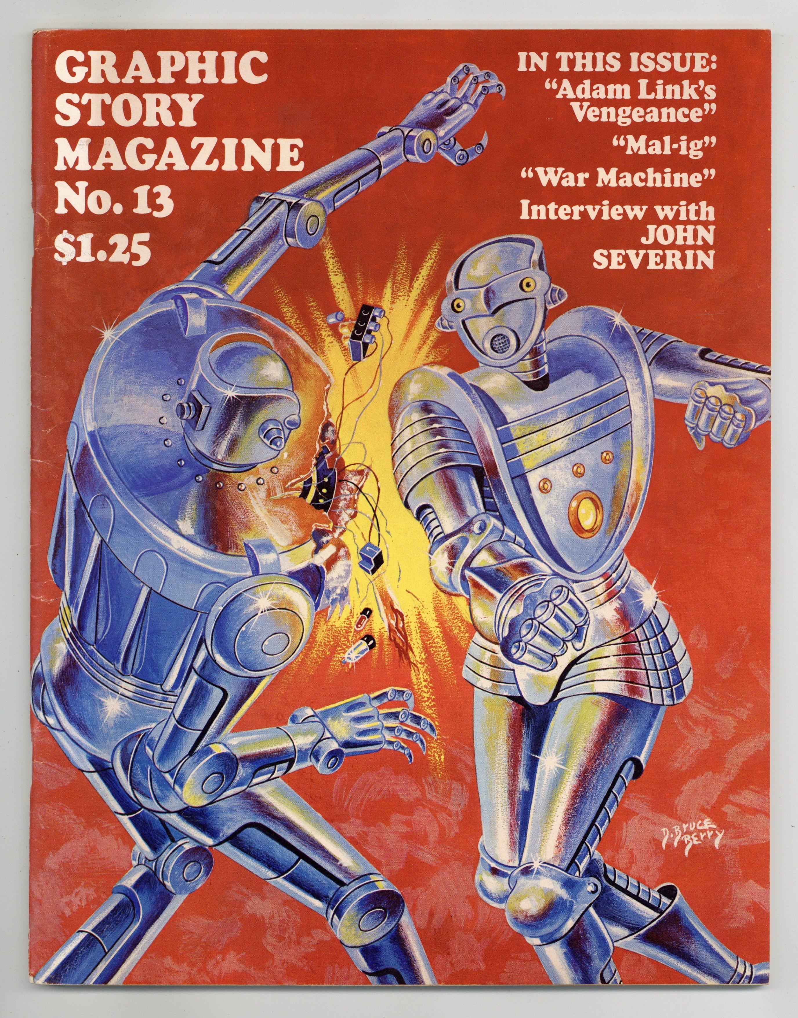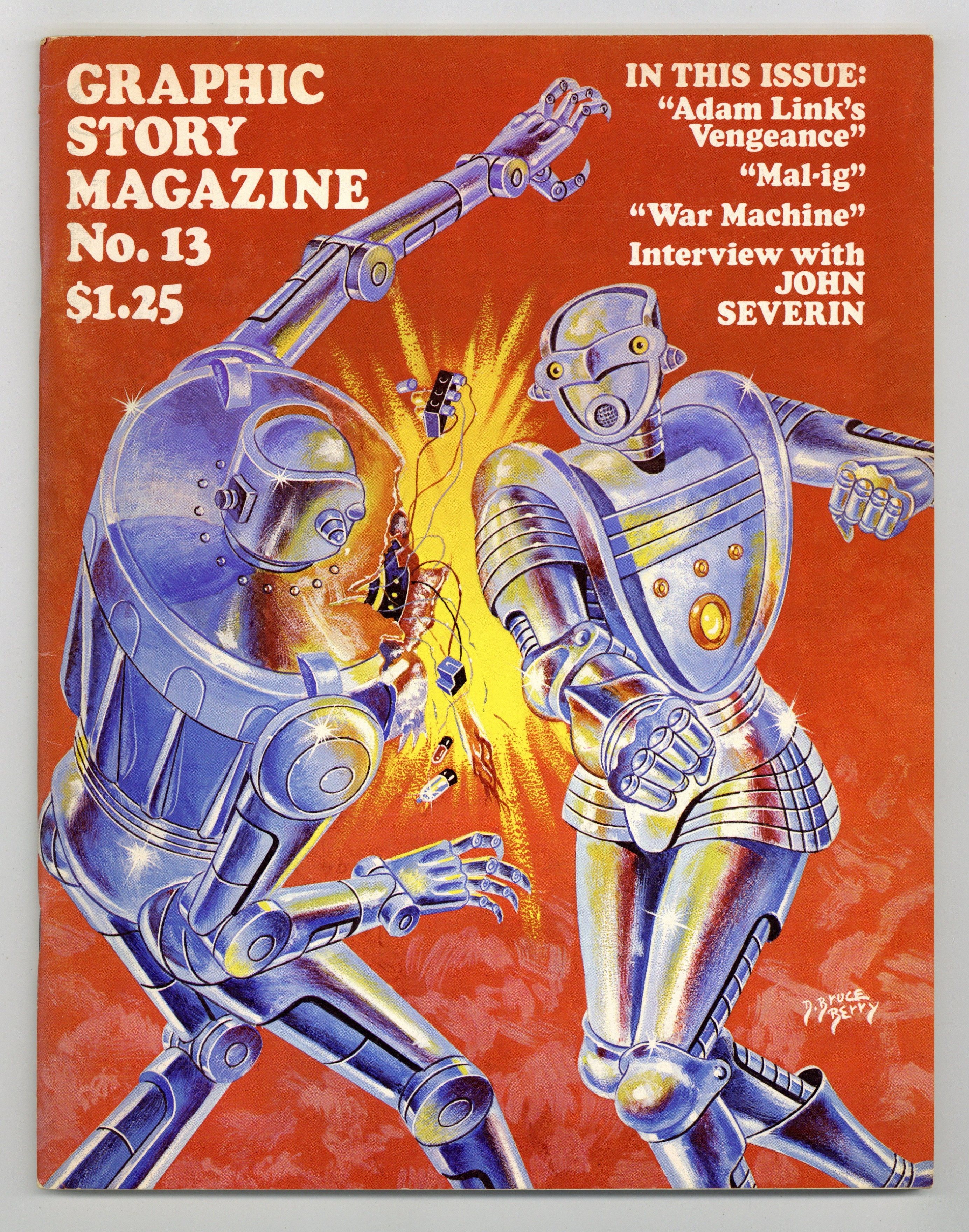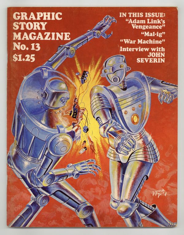 Issue # 13 of Graphic Story Magazine (formerly Fantasy Illustrated) includes the following: Mal-Ig strip by George Metzger; Adam Link's Vengeance strip by Eando Binder, D. Bruce Berry, and Bill Spicer; letters by Jerry DeFuccio of Mad Magazine and artist Gahan Wilson; "War Machine" strip by Bob Foster; an interview with John Severin; and cover art by D. Bruce Berry. Spring, 1971. 64 pgs. Cover price $1.25.