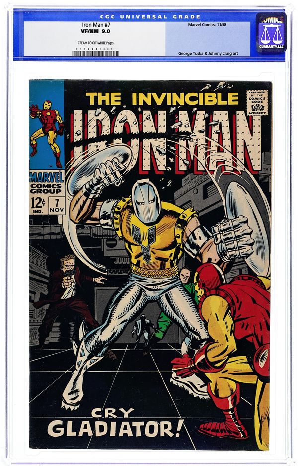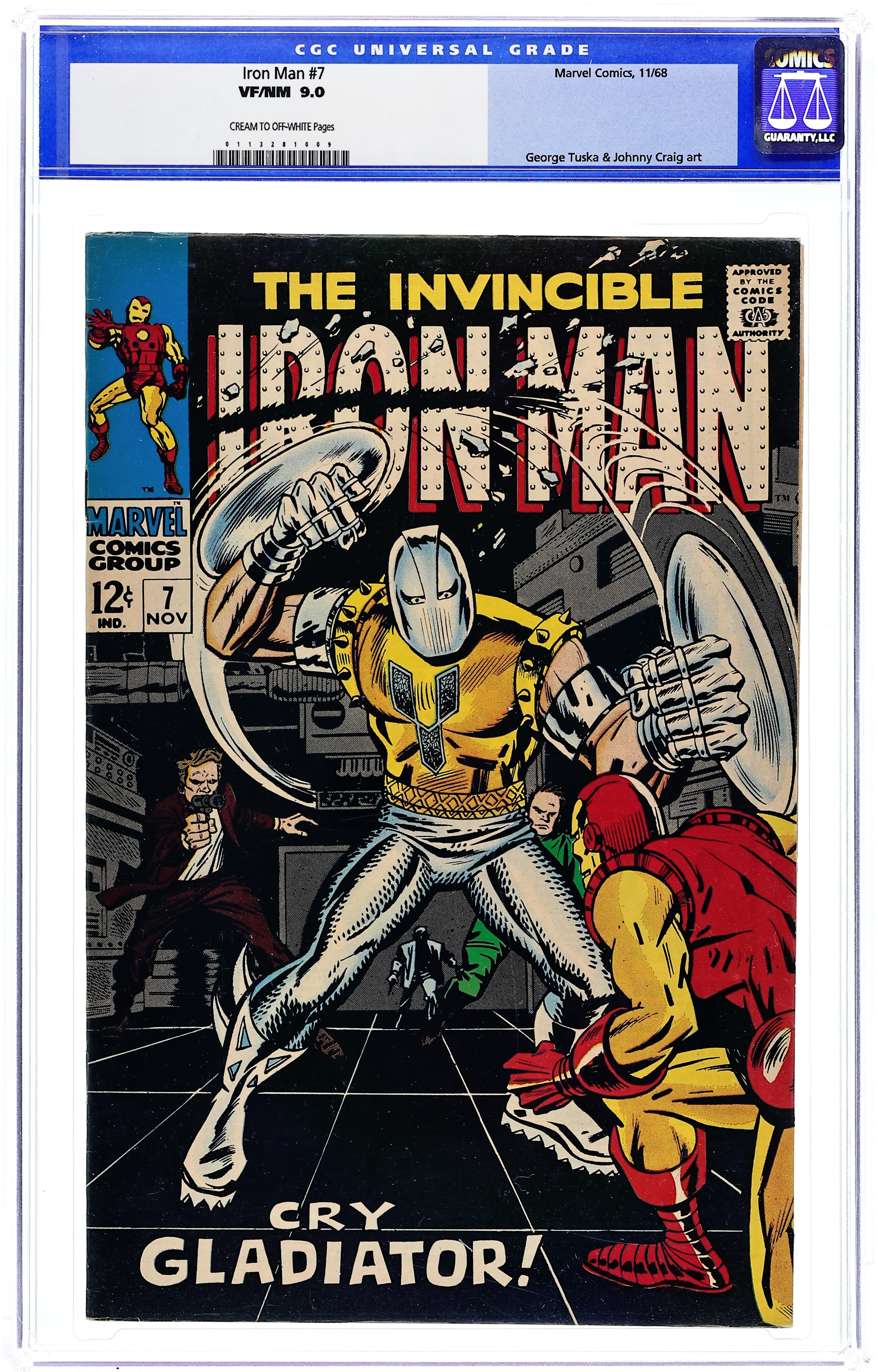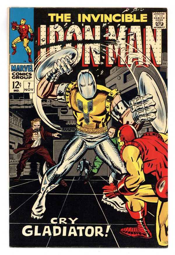 "The Maggia Strikes" Part 1 of 2. Script by Archie Goodwin. Pencils by George Tuska. Inks by Johnny Craig. Cover by George Tuska. Big M (aka Whitney Frost) and the Maggia are preparing for their assault on Stark Industries, when they add another villain to their ranks...the Gladiator! The wrist-bladed villain quickly puts his plan into action and kidnaps Janice Cord; however, the golden avenger is ready to fight for her freedom! Can Iron Man avoid those wrist blades and beat the Gladiator? Meanwhile, Whitney is having second thoughts about the Maggia's pending attack on SI, since Jasper Sitwell might get hurt. Cameo flashback appearance by Daredevil. (Note: This issue includes a full page ad for the second Spectacular Spider-Man magazine featuring Spider-Man vs. the Green Goblin. Art by John Romita.) Cover price $0.12.