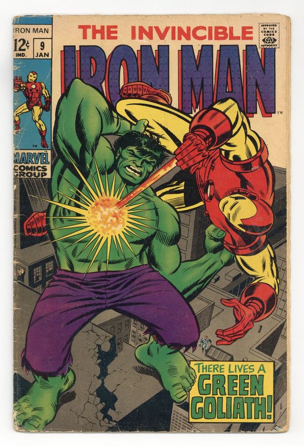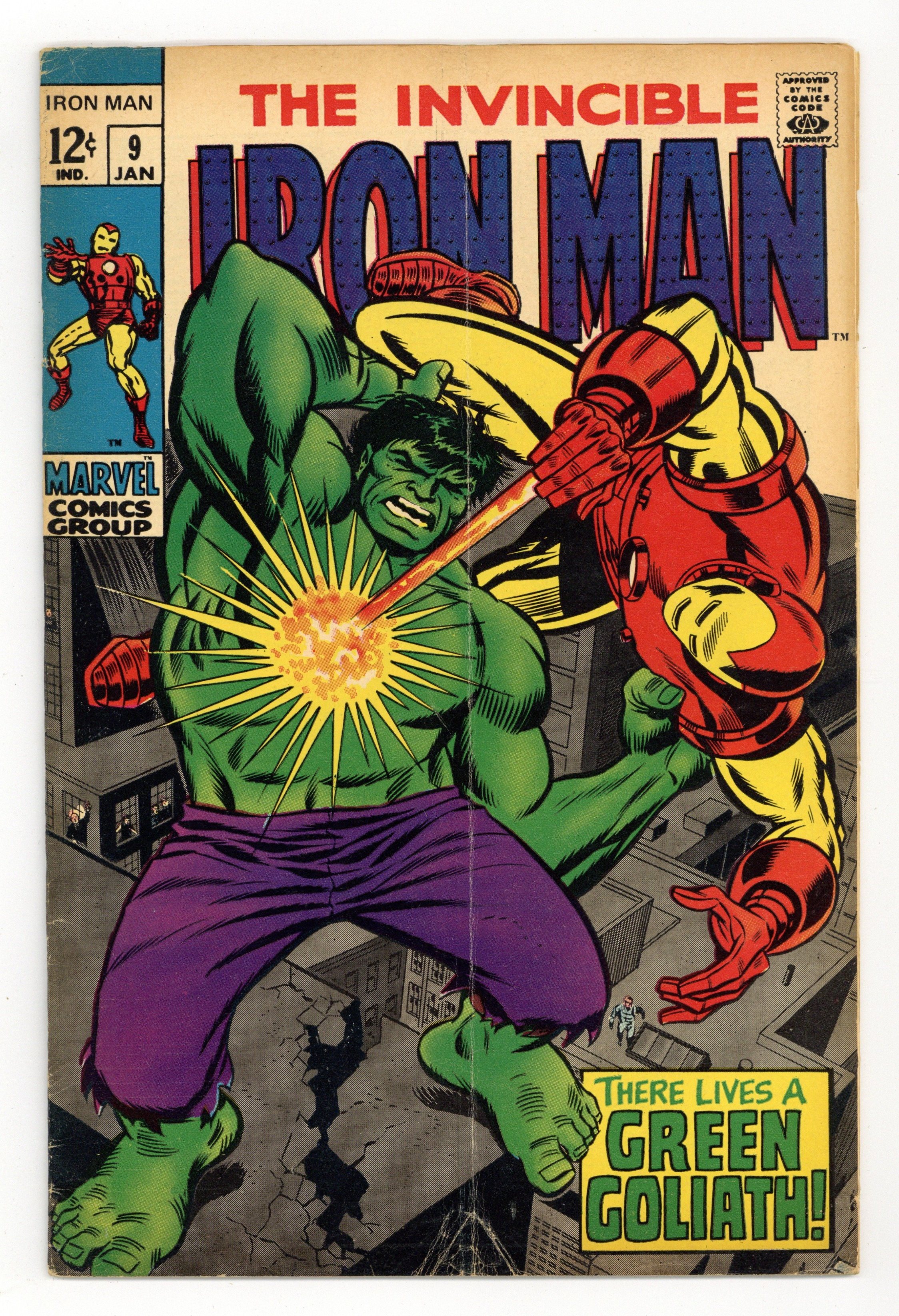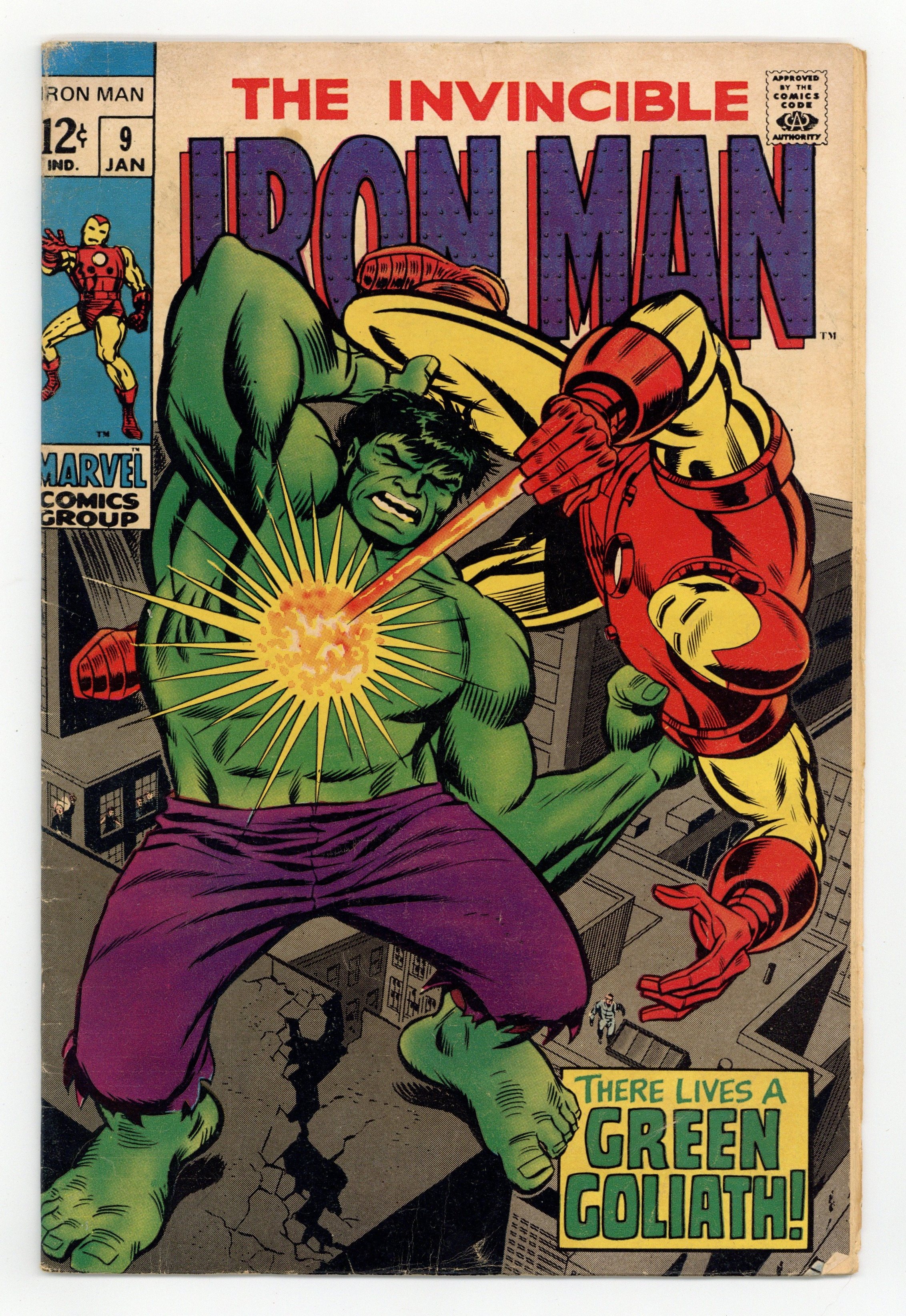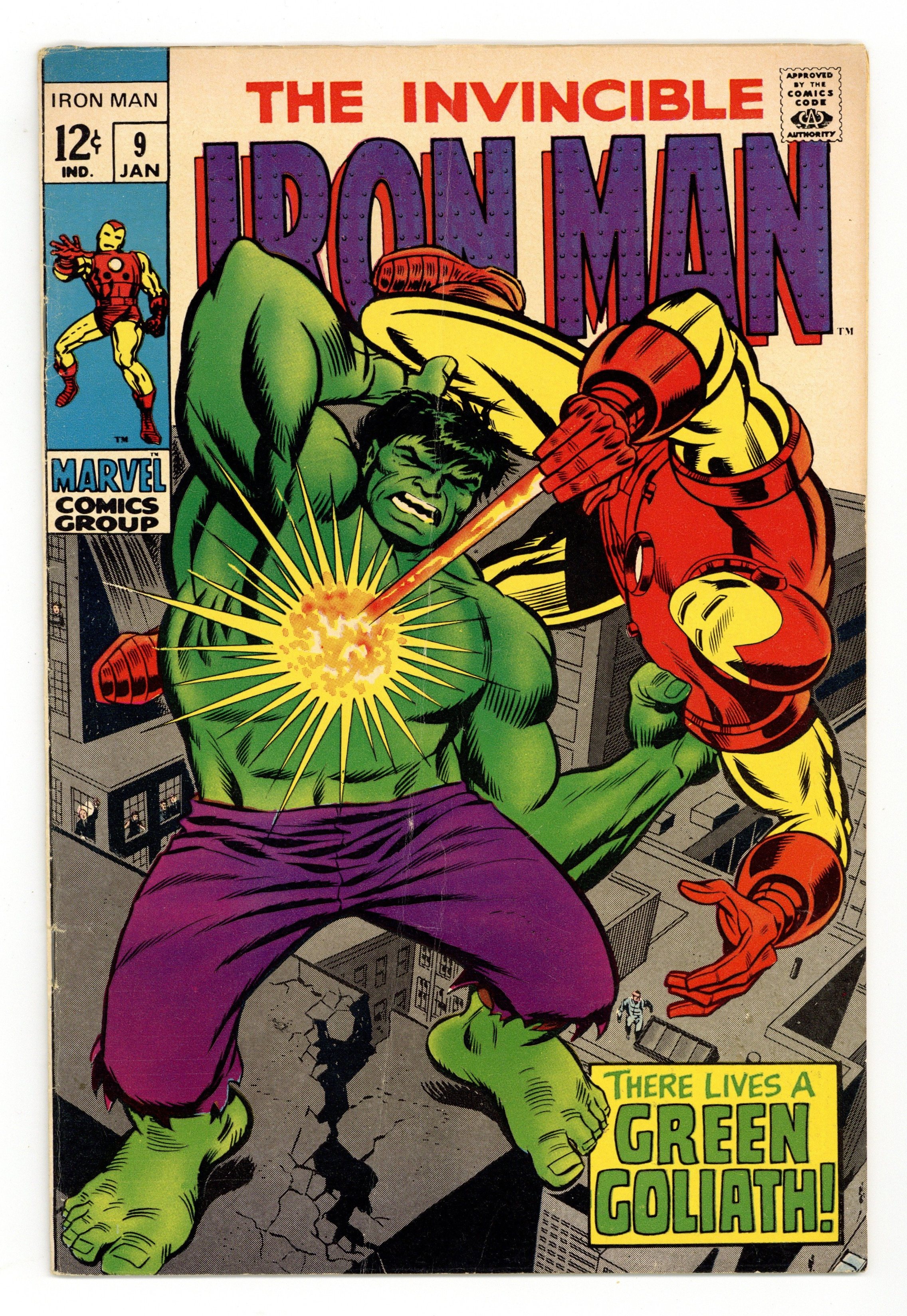 Tags: Marvel Legacy Numbering: Iron Man (part 9), Iron Man$38.50Hulk guests stars in "There Lives a Green Goliath" Part 1 of 3. Script by Archie Goodwin. Pencils by George Tuska. Inks by Johnny Craig. Cover by George Tuska. A mysterious villain has imported the Hulk to Manhattan, and sent the green goliath to get Tony Stark! After the Hulk kidnaps Janice Cord instead, the epic battle between Shell-head and the Incredible Hulk begins! But wait...is this really the Hulk...or something else? (Note: This issue was reprinted in Iron Man (1st series) 76.) Cover price $0.12.