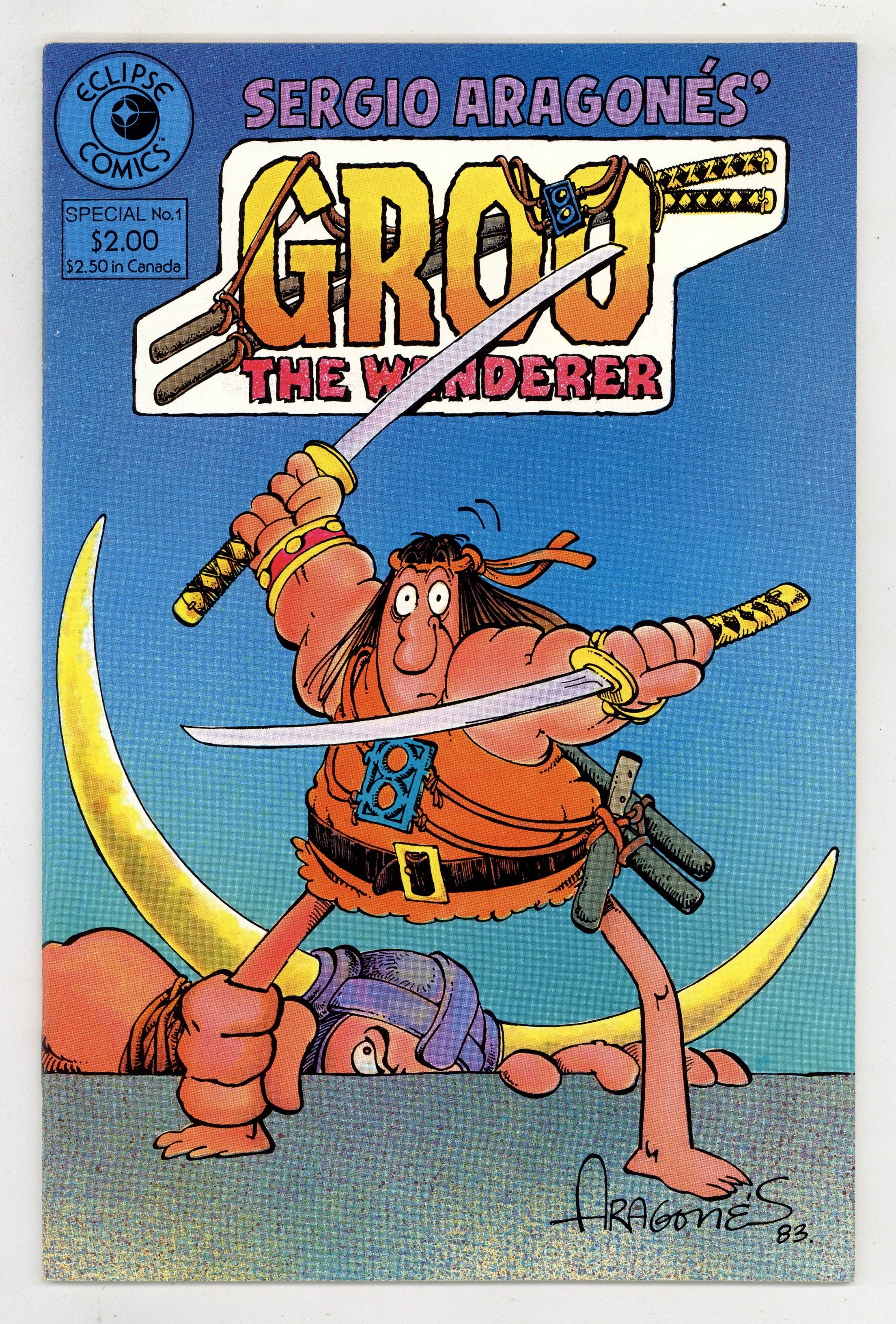 Story by Mark Evanier and Sergio Aragones. Art and cover by Sergio Aragones. Sword and sorcery comedy from Sergio Aragones, as Groo's skill with the sword is only exceeded by his stupidity, making him dangerous to friend and foe alike. The story of how Groo got his swords; Groo accidentally introduces monkeys to music; Groo battles a monster reptile for a damsel in distress. Also, behind-the-scenes commentary from creators Evanier and Aragones. The material was intended for Groo the Wanderer (1982 Pacific), but picked up by Eclipse after Pacific went out of business; the series moved on to Marvel next. The Swords of Groo; The Music of Murkos!; Groo the Wanderer. Followed by Groo the Wanderer (1985 Marvel) #1. 48 pages, Full Color. Cover price $2.00.