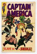 Cover pencils by Jack Kirby, inks by Dan Adkins. "Slave of the Skull!", script by Stan Lee, pencils by Jack Kirby, inks by Dan Adkins and Jim Steranko (p. 11); Shield asks Captain America to test their Life Model Decoys; After Cap easily defeats them, Nick Fury sends them back to the lab; Cap goes to Shields doctor for help with headaches; Red Skull tells Shield he has placed nuclear tape on the back of Captain America's neck; He warns that anyone who tries to remove the special tape would activate the timer on a bomb planted in Washington D.C. by one of the Skull's spies. 36 pgs., full color. $0.12. Cover price $0.12.