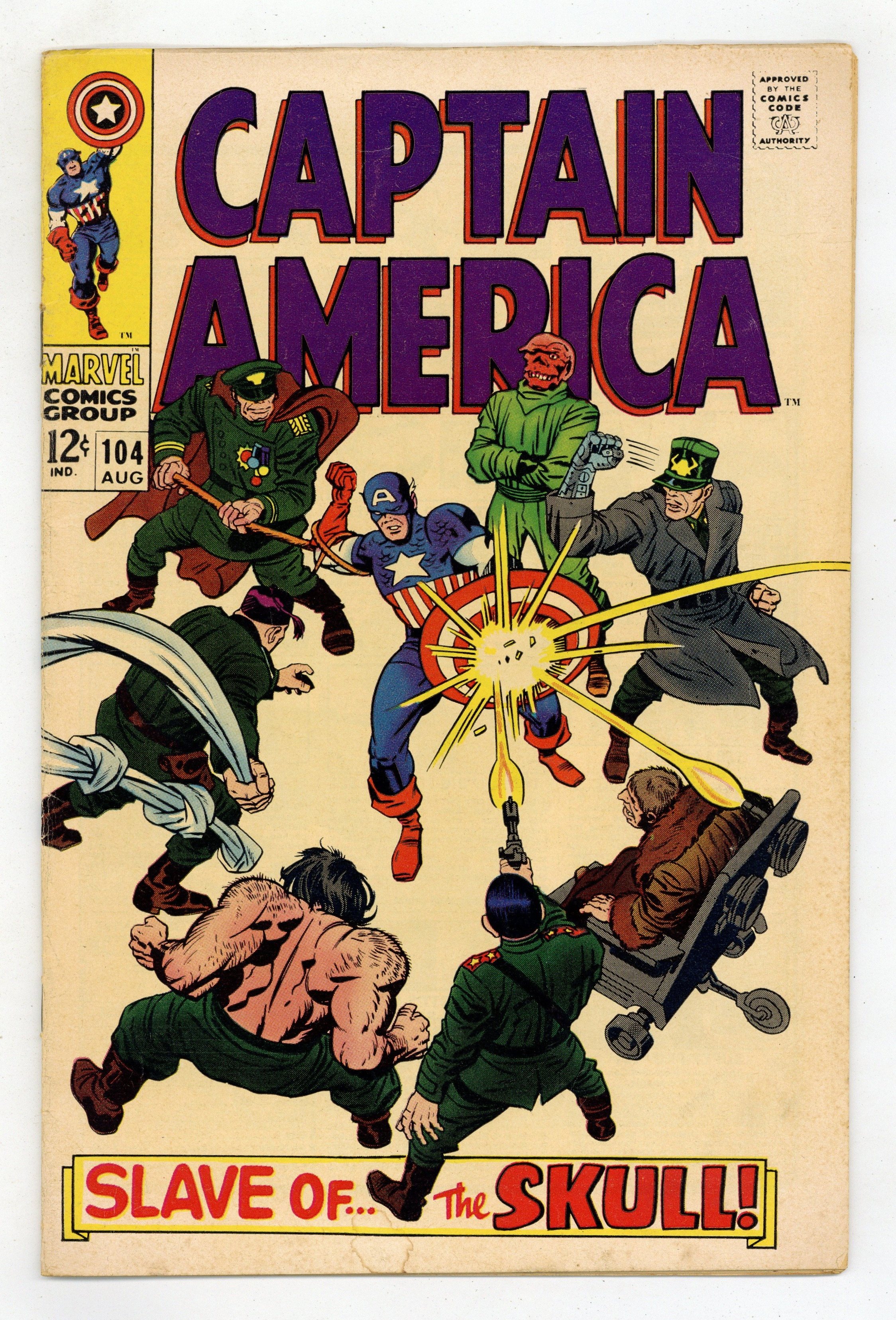 Tags: Marvel Legacy Numbering: Captain America (part 104), Captain America$23.50Cover pencils by Jack Kirby, inks by Dan Adkins. "Slave of the Skull!", script by Stan Lee, pencils by Jack Kirby, inks by Dan Adkins and Jim Steranko (p. 11); Shield asks Captain America to test their Life Model Decoys; After Cap easily defeats them, Nick Fury sends them back to the lab; Cap goes to Shields doctor for help with headaches; Red Skull tells Shield he has placed nuclear tape on the back of Captain America's neck; He warns that anyone who tries to remove the special tape would activate the timer on a bomb planted in Washington D.C. by one of the Skull's spies. 36 pgs., full color. $0.12. Cover price $0.12.