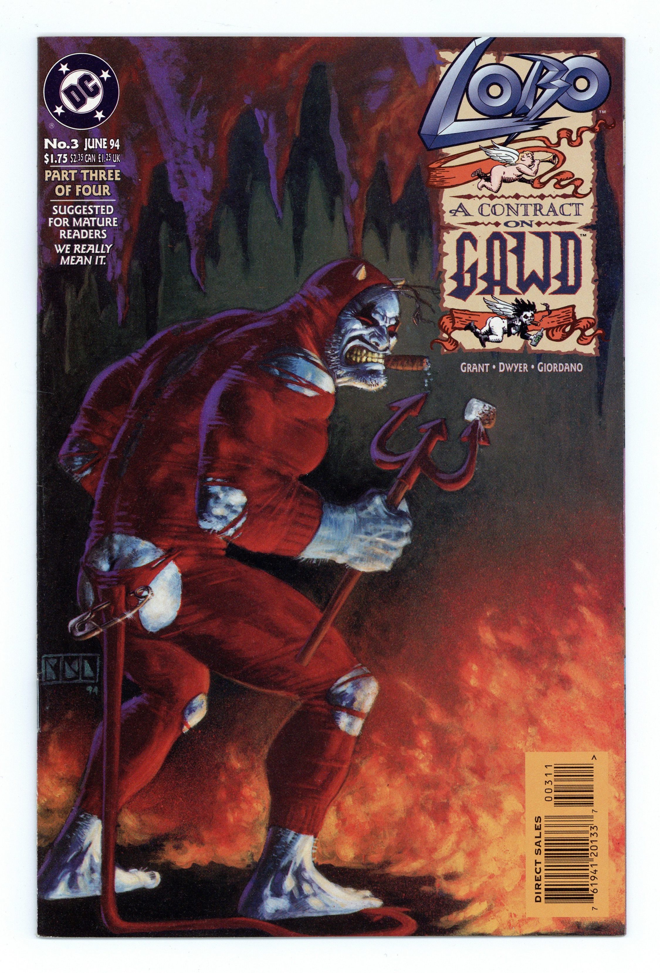 Dave, Gawd's brother and ruler of Paradize's underworld, tells Lobo that the Main Man must defeat Gawd if he ever hopes to leave. Dave's final plan to depose the supreme being of Paradize is set in motion when he contacts Abbot Costello to instigate a planetwide rebellion. Written by Alan Grant, with art by Kieron Dwyer and Dick Giordano. Painted cover by Dwyer. Suggested for Mature Readers. We Really Mean It. New Format. Cover price $1.75.