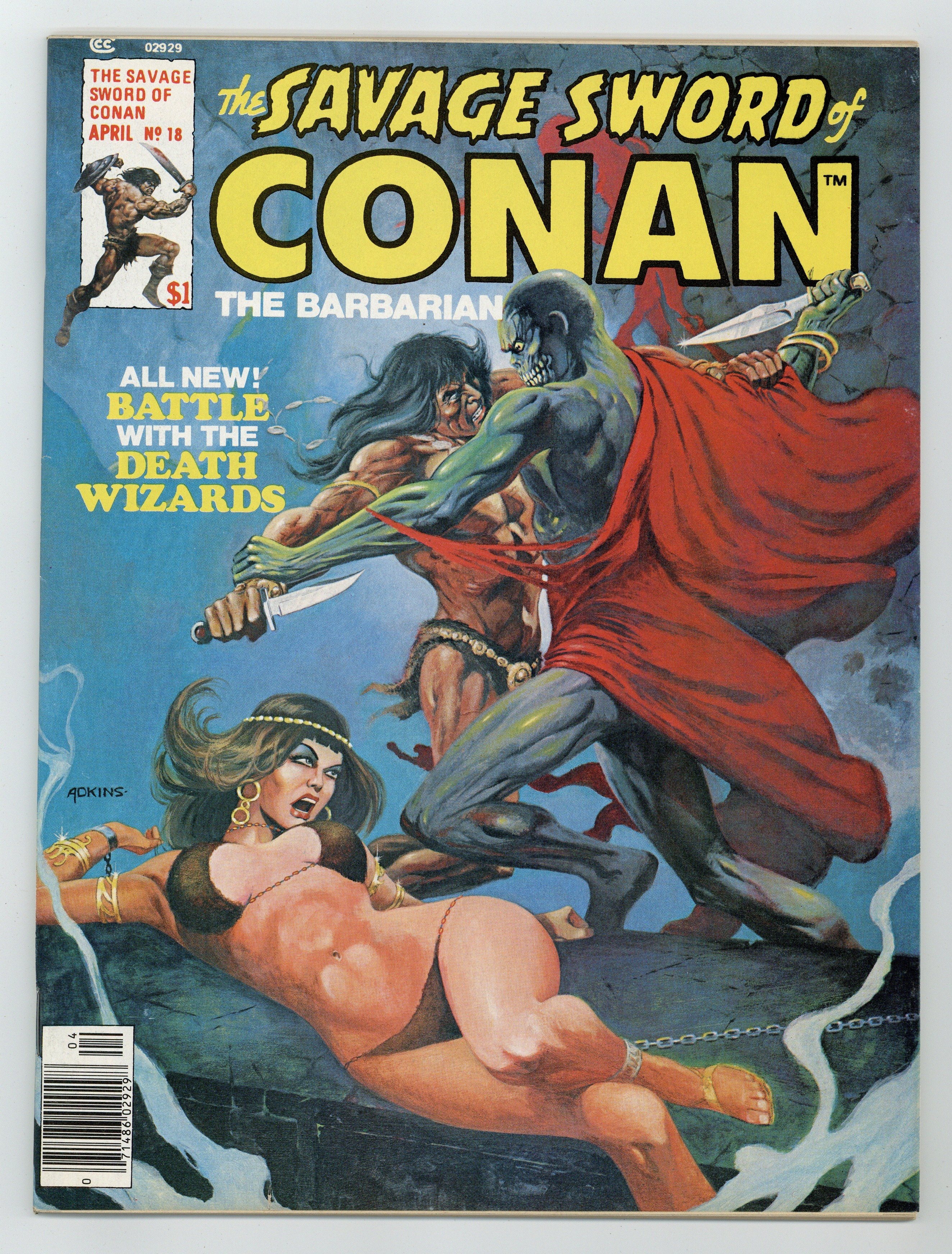 Conan stars in "The Battle of the Towers." Script by Roy Thomas, pencils by John Buscema, inks by Alfredo Alcala. Part three of the adaptation of the Robert E. Howard story "The People of the Black Circle." Solomon Kane stars in "A Battle of Bones." Script by Thomas, art by Howard Chaykin. Adapted from the Howard story. Al Milgrom illustration. Fred Blosser reviews "The Annotated Guide to Robert E. Howard's Sword & Sorcery" by Robert Weinberg in "A Handbook Shall Be Born." Illustrations by John Buscema and Pat Broderick. Blosser reviews Howard's "The Swords of Shahrazar" in "Crimson Blades of Dark Vendhya." Illustrations by Michael Kaluta. Tim Conrad frontispiece. Dan Adkins cover. Cover price $1.00.