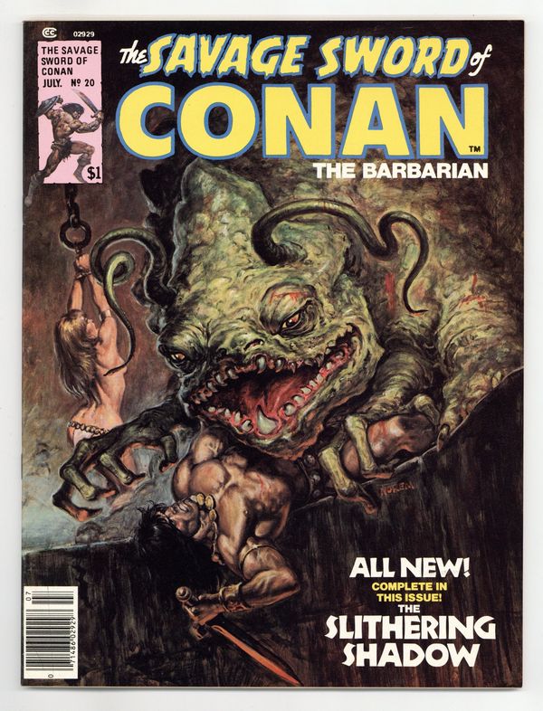 Conan stars in "The Slithering Shadow." Script by Roy Thomas, pencils by John Buscema, inks by Alfredo Alcala. Adapted from the story by Robert E. Howard. Solomon Kane stars in "Solomon Kane's Homecoming." Poem by Howard, adapted by Thomas, pencils by Virgilio Redondo, inks by Rudy Nebres. "Sing a Song of Sonjas," a Red Sonja photo feature from the San Diego Comicon by Al Satian (including photos of Thomas and Howard Chaykin). Mike Nasser/Dick Giordano frontispiece. Earl Norem cover. Cover price $1.00.