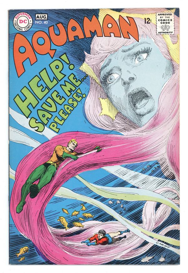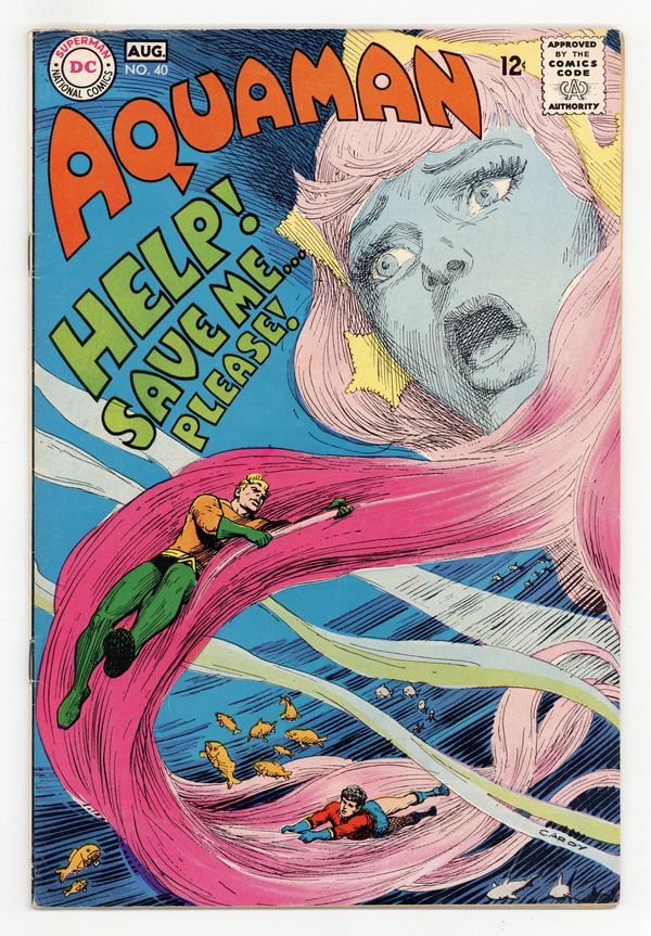 $35.00Cover art by Nick Cardy. Sorcerers of the Sea starring Aquaman, Aqualad, Mera, Aquagirl, Aquababy, Vulko, and The Sea Sorcerers, script by Steve Skeates, art by Jim Aparo (1st for DC); Mera kidnapped, multi-issue quest for Mera begins; story continues in Aquaman #41. Cap's Hobby Hints activity half-page by Henry Boltinoff. 36 pgs. $0.12. Cover price $0.12.