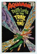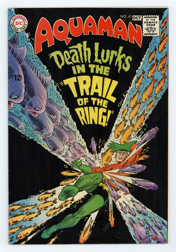 $23.50Cover art by Nick Cardy. The Trail of the Ring! starring Aquaman, Aqualad, Aquagirl, Aquababy, Mera (flashback), Vulko, Harkran, and Zancol, script by Steve Skeates, art by Jim Aparo; Aquaman continues his quest to find the missing Mera. Letter from comics writer Tony Isabella. House ad for Superman's Girl Friend Lois Lane #86 (October 1968), written as a wedding invitation, art by Neal Adams. House ad for non-specific next issue of House of Mystery. 36 pgs. $0.12. Cover price $0.12.