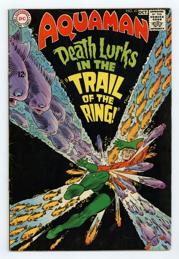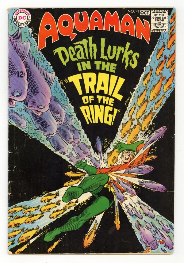 $38.50Cover art by Nick Cardy. The Trail of the Ring! starring Aquaman, Aqualad, Aquagirl, Aquababy, Mera (flashback), Vulko, Harkran, and Zancol, script by Steve Skeates, art by Jim Aparo; Aquaman continues his quest to find the missing Mera. Letter from comics writer Tony Isabella. House ad for Superman's Girl Friend Lois Lane #86 (October 1968), written as a wedding invitation, art by Neal Adams. House ad for non-specific next issue of House of Mystery. 36 pgs. $0.12. Cover price $0.12.