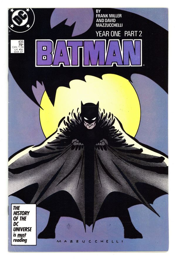 Starts Jan 19 First Printing. Direct Edition. Batman Year One, Chapter Two: "War Is Declared". Part 2 of 4, continued from the previous issue. Story continues next issue. Bruce Wayne dons the cape and cowl for the first time to take the fight to the criminal element, while James Gordon stirs up trouble within his own department. Script by Frank Miller, art by David Mazzucchelli. Harvey Dent appears as Assistant District Attorney. Mazzucchelli cover. 1st printing. NOTE: Most issues from 397-432 were reprinted in 1989 and sold in multipacks. These 2nd and 3rd prints have back cover ads dated 1989. 36 Pages, Full Color. Cover price $0.75.