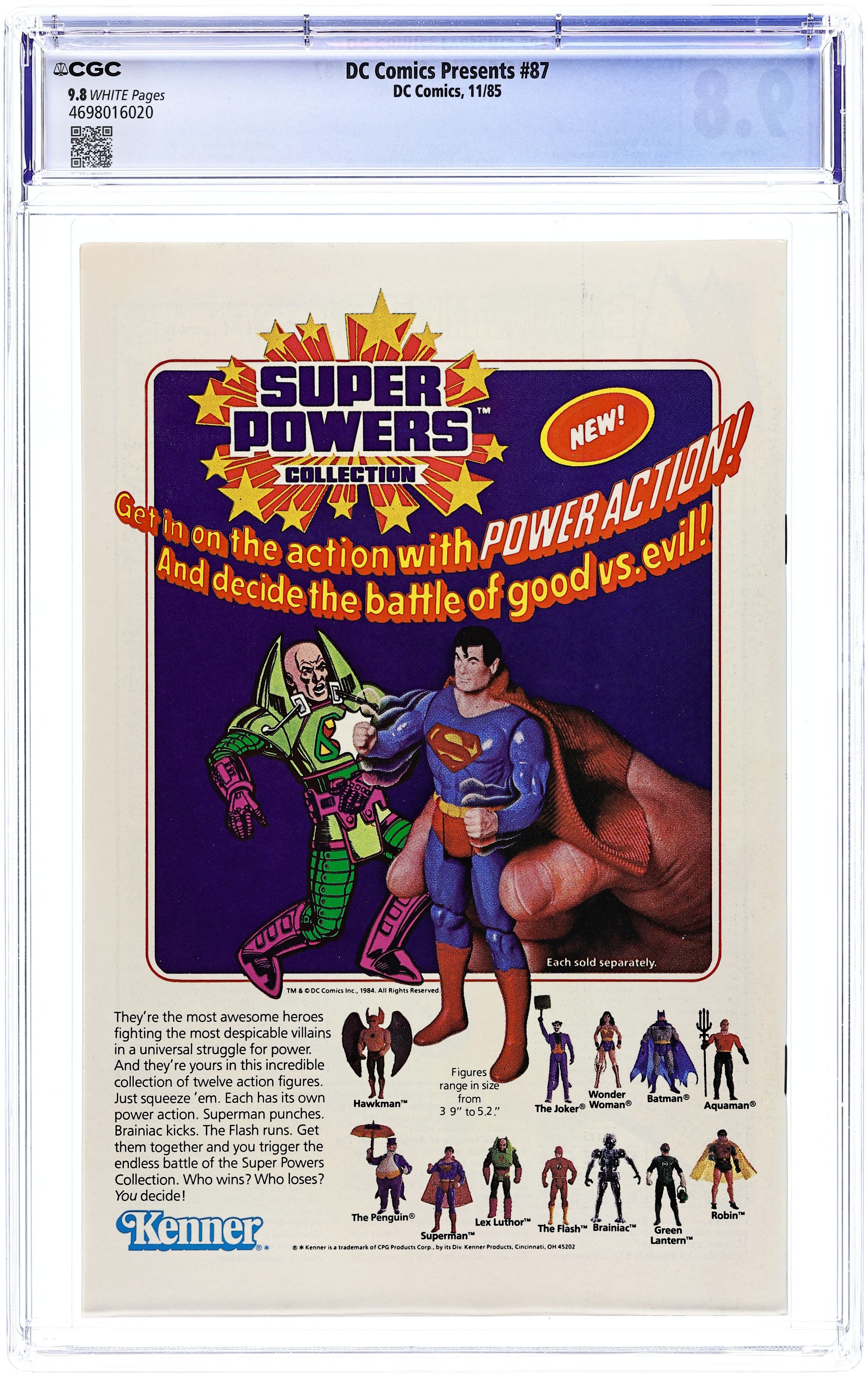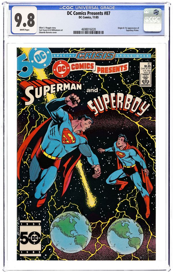 Direct Edition. Crisis on Infinite Earths cross-over. Zapped by an alien ray, Superman hops dimensions and teams up with Superboy-Prime to battle Polarians on Earth-Prime in the 24-page "Year of the Comet." Continued in Adventures of Superman (1939) #414. Script by Elliot S! Maggin, art by Curt Swan & Al Williamson. Plus: the 16-page "Origin of Superboy-Prime" by Maggin, Swan & Williamson. Cover by Eduardo Barreto. Cover price $1.25.