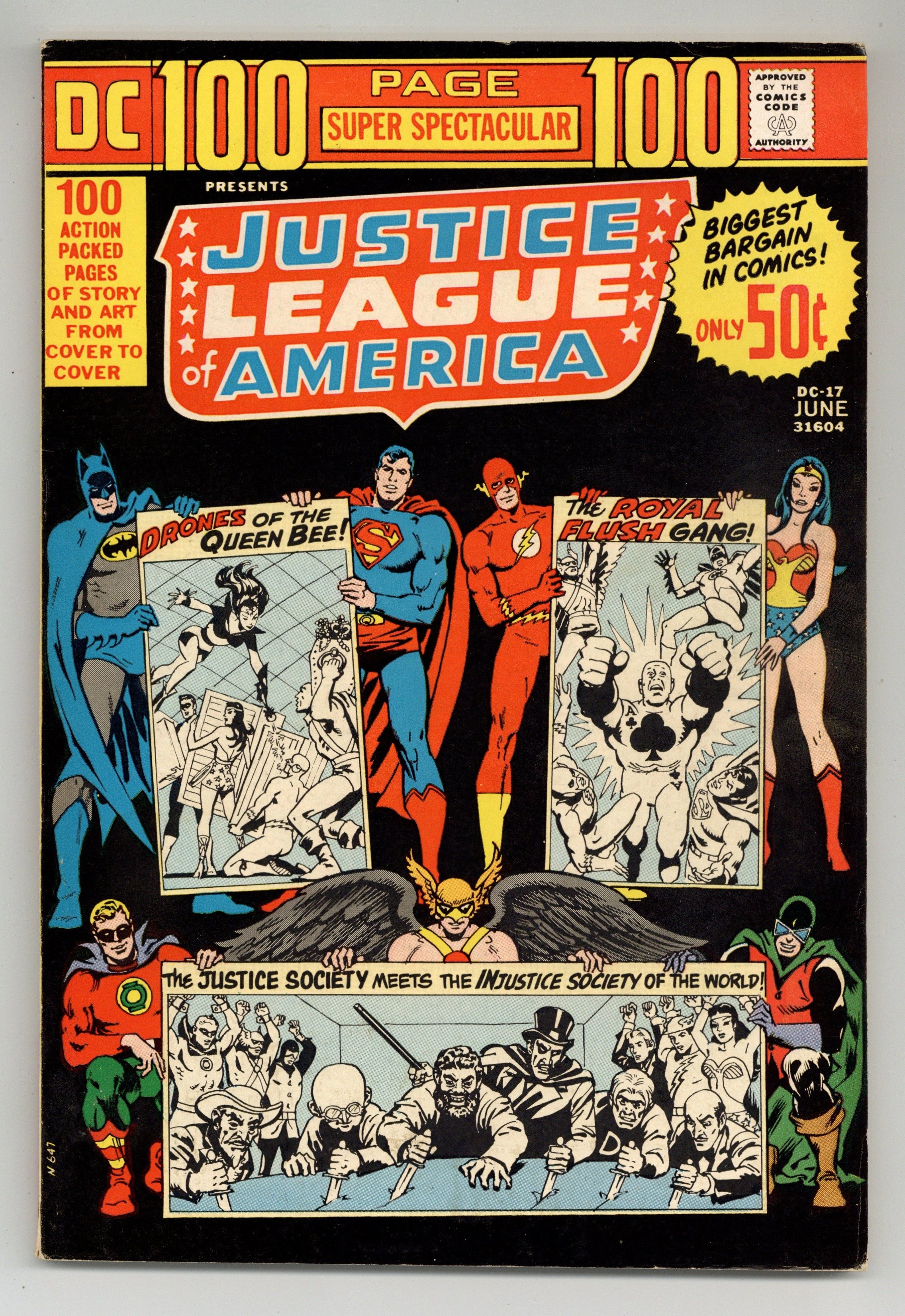 All reprints. Justice League of America star in "Drones of the Queen Bee!" (script by Gardner Fox, pencils by Mike Sekowskly, inks by Bernard Sachs; from JLA # 23). The Justice Society of America star in "The Injustice Society of the World!" (art by Irwin Hasen; from All-Star Comics 37 in 1947). Golden Age Sandman stars in an untitled story (from Adventure 65 in 1941). JLS stars in "The Card Games of the Royal Flush Gang!" (script by Fox, art by Sekowsky/Sachs; from JLA 43). Cover price $0.50.