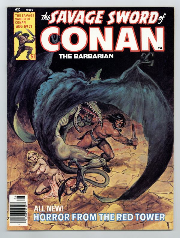 Conan stars in "The Horror From the Red Tower." Script by Roy Thomas, pencils by John Buscema, inks by Sonny Trinidad. Adapted from an unfinished story by Robert E. Howard. "What the She-Devil," a Red Sonja photo feature by Mario A. Cavallini and Nick Arroyo. Includes Elfquest's Wendy Pini as Sonja (4 photos) plus Roy Thomas, Frank Thorne, Dick Giordano, and Pablo Marcos. Ernie Chan frontispiece. Earl Norem cover. Cover price $1.00.