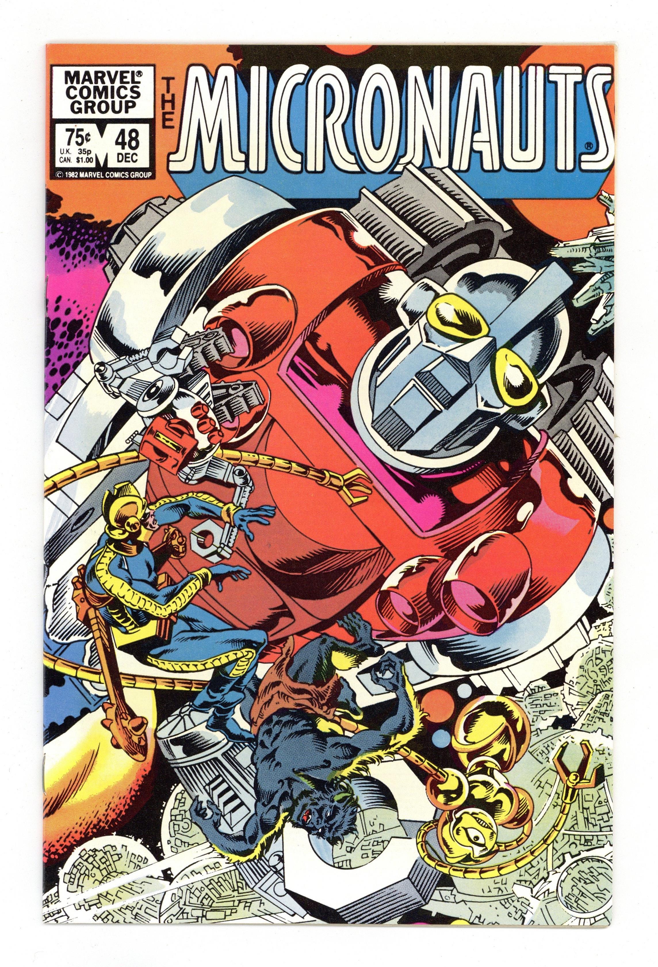 $4.00Wraparound cover art, pencils by Ed Hannigan, inks by Danny Bulanadi. "Resurrection!", script by Bill Mantlo, pencils by Jackson Guice (as Butch Guice, breakdowns) and Danny Bulanadi (finished art), inks by Danny Bulanadi; Arcturus Rann learns the secret of the Bioship, and prepares to return to Homeworld. Happy 4th Birthday, Micronauts! illustration, pencils by Jackson Guice (as Butch Guice), inks by Danny Bulanadi. 36 pgs., full color. Cover price $0.75.