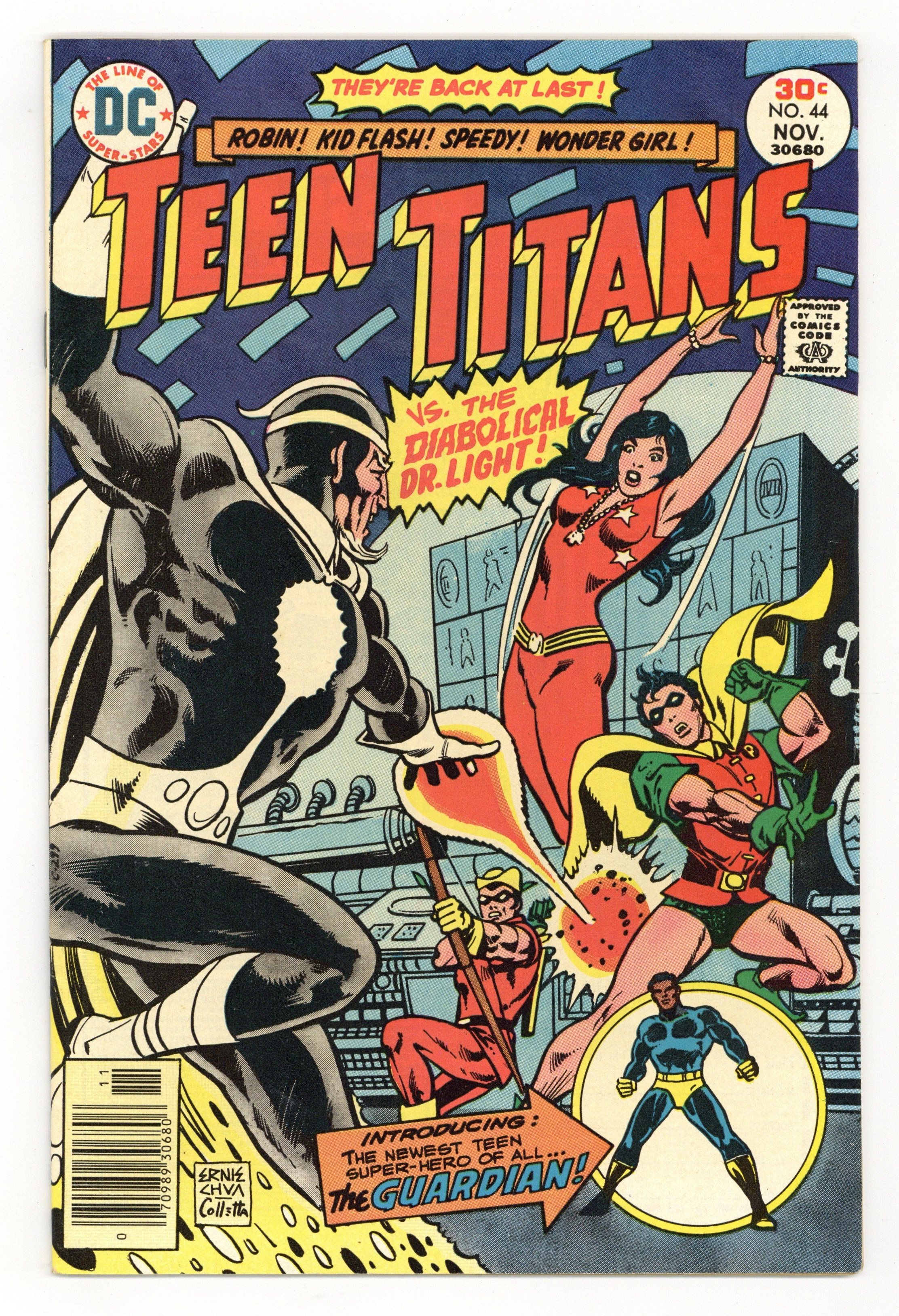 First 30c cover-priced issue. Written by Paul Levitz and Bob Rozakis. Art by Pablo Marcos and Bob Smith. Cover by Ernie Chan and Vince Colletta. Dr. Light traps and defeats the disbanded Titans until Mal becomes the Guardian to turn the tables. Speedy revealed to be nephew of Golden Age Guardian. First appearance of Karen Beecher. 36 Pages, Full Color. Cover price $0.30.