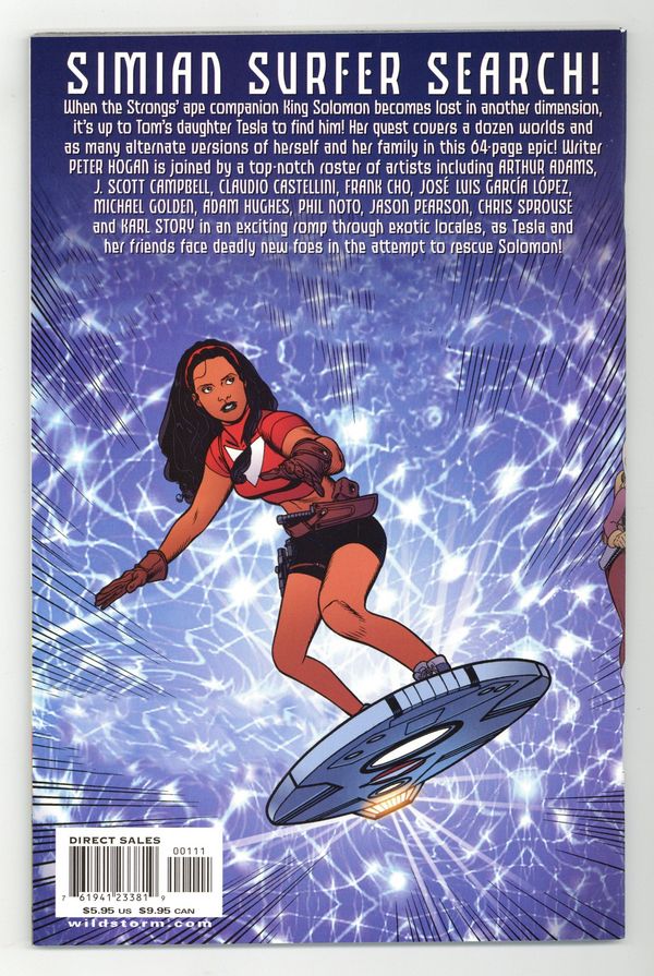 WRITTEN BY PETER HOGAN AND ALAN MOORE; ART BY ARTHUR ADAMS, J. SCOTT CAMPBELL, CLAUDIO CASTELLINI, FRANK CHO, JOSE LUIS GARCIA-LÓPEZ, MICHAEL GOLDEN, ADAM HUGHES, PHIL NOTO, JASON PEARSON, CHRIS SPROUSE, KARL STORY; COVERS BY ARTHUR ADAMS AND BRUCE TIMM In stores May 14. A spectacular romp through a dozen dizzying dimensions by some of the world's best comics artists! Join Tesla Strong as she hops from one dimension to the next in search of her simian pal Solomon. For more information, see the feature article. Note: This issue will ship with two covers. All orders will be filled with covers by Arthur Adams (50%) and Bruce Timm (50%). FC, 64 PG. $5.95 Cover price $5.95.
