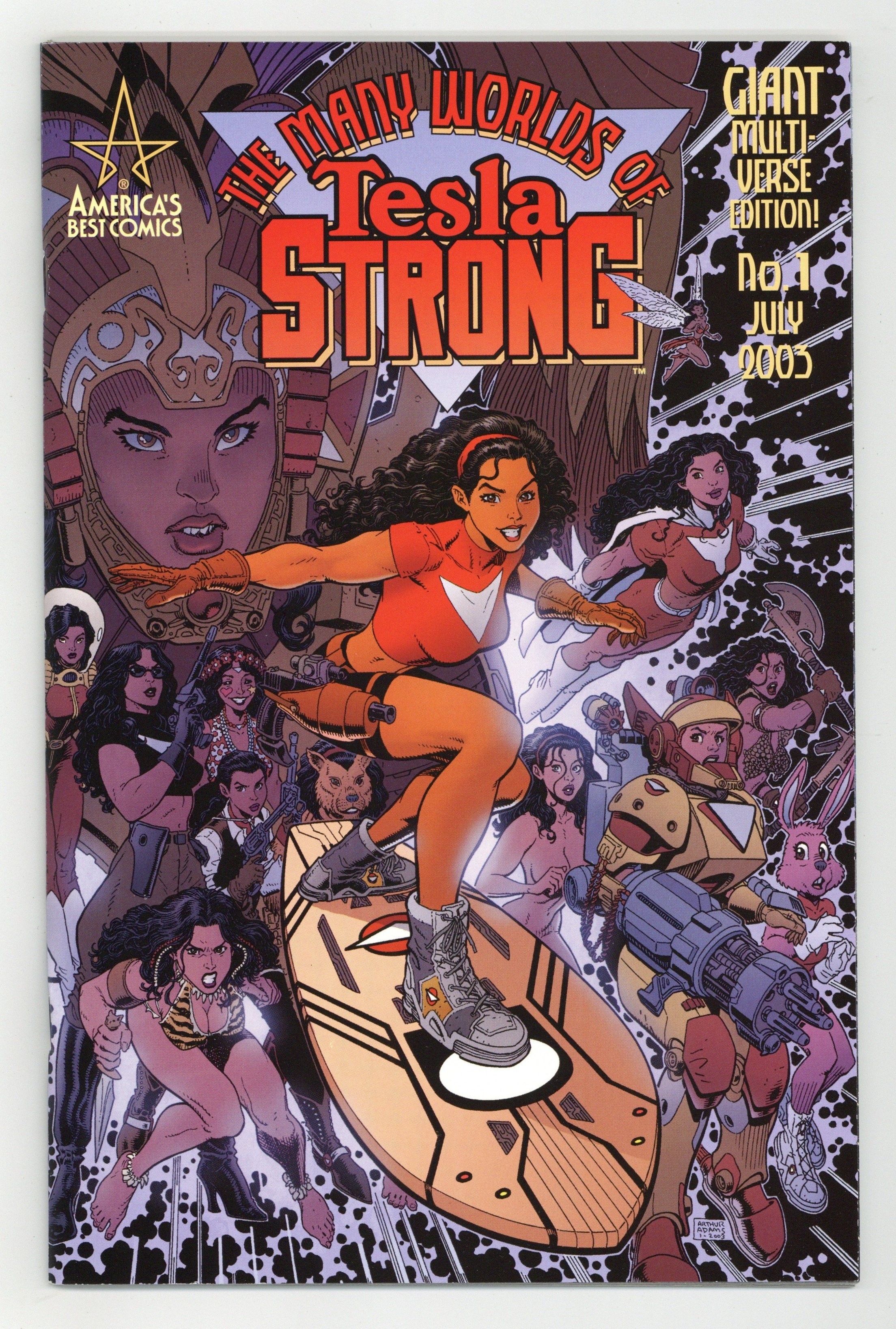 Published Jul 2003 by America's Best Comics.$27.00WRITTEN BY PETER HOGAN AND ALAN MOORE; ART BY ARTHUR ADAMS, J. SCOTT CAMPBELL, CLAUDIO CASTELLINI, FRANK CHO, JOSE LUIS GARCIA-LÓPEZ, MICHAEL GOLDEN, ADAM HUGHES, PHIL NOTO, JASON PEARSON, CHRIS SPROUSE, KARL STORY; COVERS BY ARTHUR ADAMS AND BRUCE TIMM In stores May 14. A spectacular romp through a dozen dizzying dimensions by some of the world's best comics artists! Join Tesla Strong as she hops from one dimension to the next in search of her simian pal Solomon. For more information, see the feature article. Note: This issue will ship with two covers. All orders will be filled with covers by Arthur Adams (50%) and Bruce Timm (50%). FC, 64 PG. $5.95 Cover price $5.95.
