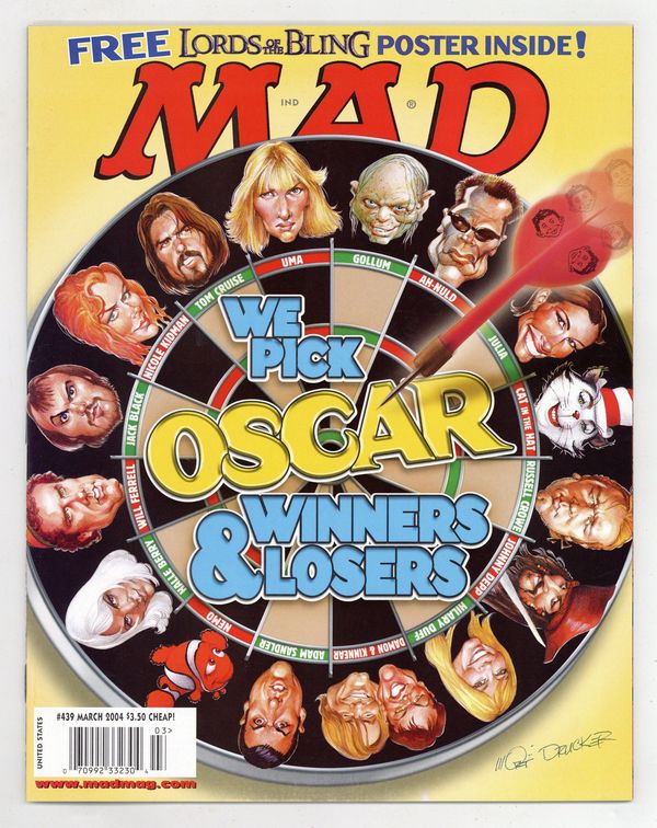 Cover by Mort Drucker. Stories and art by Drew Friedman, Evan Dorkin, Al Jaffee, Dick DeBartolo, Anthony Barbieri and Bill Wray, Arnie Kogen, Matthew A. Cohen, David Shayne, Barry Liebmann, John Caldwell, Greg Leitman, Arie Kaplan, Butch D'Ambrosio, Ray Alma, Desmond Devlin, Garth Gerhart, Arie Kaplan, Jeff Kruse, Scott Maiko, Kevin Pope, Mike Snider, Jack Syracuse, Angelo Torres, Liz Lomax, Scott Bricher, Rick Tulka, Hermann Mejia, Tom Nick Cocotos, Mark Stutzman, Peter Kuper, and Sergio Aragones. Mad's take on the Oscars includes an Oscar preview, featuring art by Drew Friedman and the Usual Gang of Idiots; Sergio Aragones' version of the Oscars; and a cover by Mort Drucker. A parody of tall-ships drama Master and Commander. D-List actors, featuring art by noted caricaturist Drew Friedman. Mad's takes on Apple ads, goth kids, and valet parking. Monroe, Marginals by Sergio Aragones, and Spy vs. Spy. The Fundalini Pages; Masochist Commander: One the Farce Side of the World; The Valet Parking Attendants Secret Oath; A Mad Look at the Oscars; The Lords of the Bling; Monroe and… Survivor Jr., Part 2; Mad's Down-on-the-Farm: The Simple Life Outtakes!; If Other Companies Copied the iPod Ad Campaign; Rock Solid Indications You Are Too Old for the Goth Lifestyle; If Home Improvement Shows Turned to Arson; Are You a Member of Hollywoods D-List?; Spy vs. Spy; Mad's Oscar Preview: The Insiders Guide to the Longest, Most Boring Television Show of the Year!; Fold-In. 8.5-in. x 11-in., 48 pages, PC/PB&W. Cover price $3.50.