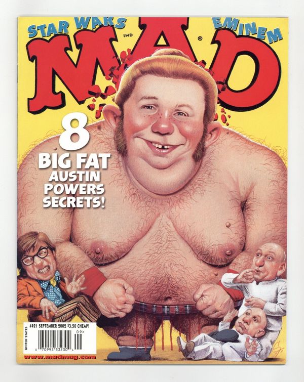 Cover by C. F. Payne. Stories and art by Drew Friedman, Al Jaffee, Dick DeBartolo, Anthony Barbieri and Bill Wray, Mike Snider, Desmond Devlin, David Shayne, John Caldwell, Scott Sonneborn, Jeff Kruse, Barry Liebmann, Rick Tulka, Hermann Mejia, Mort Drucker, James Warhola, Bob Staake, Tom Nick Cocotos, Tom Richmond, Tom Bunk, Peter Kuper, and Sergio Aragones. Parodies of Star Wars Episode II and Jay Leno's Tonight Show, featuring art by Mort Drucker and Bob Staake. Eminem as a senior citizen, and insider info on Austin Powers in Goldmember. Scandal and cover-up websites, featuring art by noted caricaturist Drew Friedman. Sergio Aragones' version of Star Wars Episode II. Mad's takes on video wills, animal crackers, and pro baseball. Monroe, Marginals by Sergio Aragones, and Spy vs. Spy. Letters page contains a note on the passing of longtime Mad artist Dave Berg. 8 Top Secret Facts About Austin Powers in Goldmember That Mike Myers Doesn't Want You to Know; Drastic Cutbacks in the Music Industry; Star Bores Epic Load II - Attack of the Clowns; Monroe and... The Big House; Mad Deconstructs TV Talk Shows - The Tonight Show with Jay Leno; The U.S. Conference of Catholic Bishops' Official Edict on Pedophile Priests; Eminem - The Senior Citizen Years; The Lighter Side of...; Spy vs. Spy; A Mad Look at Star Wars Attack of the Clones; Conclusive Evidence of the Ever-Widening Gap Between Baseball's Small and Large Market Teams; Confidential Documents You Won't Find On thesmokinggun.com; How to Spice Up Your Video Will; Mad's Thumbs Up / Thumbs Down Review - Austin Powers in Goldmember; Fold-In. 8.5-in. x 11-in., 48 pages, PC/PB&W. Cover price $2.99.