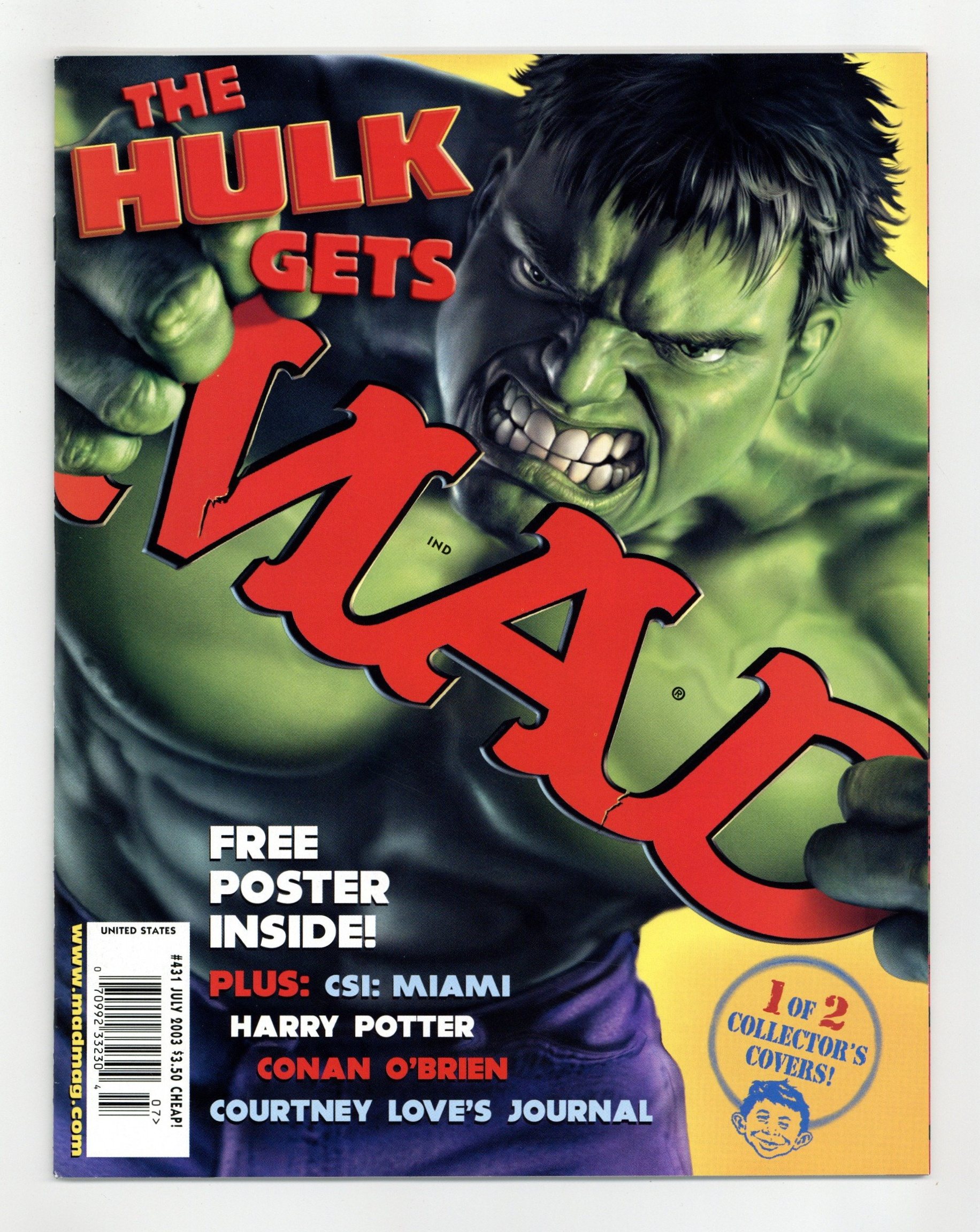 Tags: Hulk$13.00Variant cover ("The Hulk Gets Mad") by Mark Fredrickson. Stories and art by Drew Friedman, Al Jaffee, Dick DeBartolo, Anthony Barbieri and Bill Wray, Mike Snider, Don (Duck) Edwing, Arnie Kogen, Arie Kaplan, Josh Malinow, Don Vaughan, Jacob Lambert, Barry Liebmann, John Caldwell, Greg Leitman, Desmond Devlin, Tom Richmond, Mort Drucker, Scott Bricher, Tom Nick Cocotos, Sam Sisco, Hermann Mejia, Ray Alma, Irving Schild, Peter Kuper, and Sergio Aragones. Mad's salute to the Hulk and his 2003 movie incarnation includes two variant covers, five articles, and even a real Got Milk ad featuring the Hulk. Parodies of TV's CSI Miami and Conan O'Brien's Late Night, featuring art by Mort Drucker and noted caricaturist Drew Friedman. Mad's takes on dieting, Sesame Street, and Amazon.com. Monroe, Marginals by Sergio Aragones, and Spy vs. Spy. Letters page includes readers' guesses to the definition of the longstanding Mad nonsense word "Potrzebie." C.S.Oy: Miami; Shamazon.com: Harry Potter and the Order of the Phoenix; Spy vs. Spy; Mad Deconstructs TV Talk Shows - Late Night with Conan O'Brien; A Mad Look at Dieting; Mad's New Sesame Street Characters That Better Reflect Today's World; Al-Jazeera TV Guide; Selected Highlights from Courtney Love's Journal; Which Big Budget Summer Blockbuster Will Make the Most Money?; Monroe and... The Big Apple - Part One; Hulk-A-Rama; The 10 Most Pathetic Hulk Fans; Behind the Scenes on the Set of The Hulk; Mad's Less-Than-Incredible Hulk Outtakes; The Hulk Has a Bad Week; Fold-In. 8.5-in. x 11-in., 48 pages, PC/PB&W. Cover price $3.50.