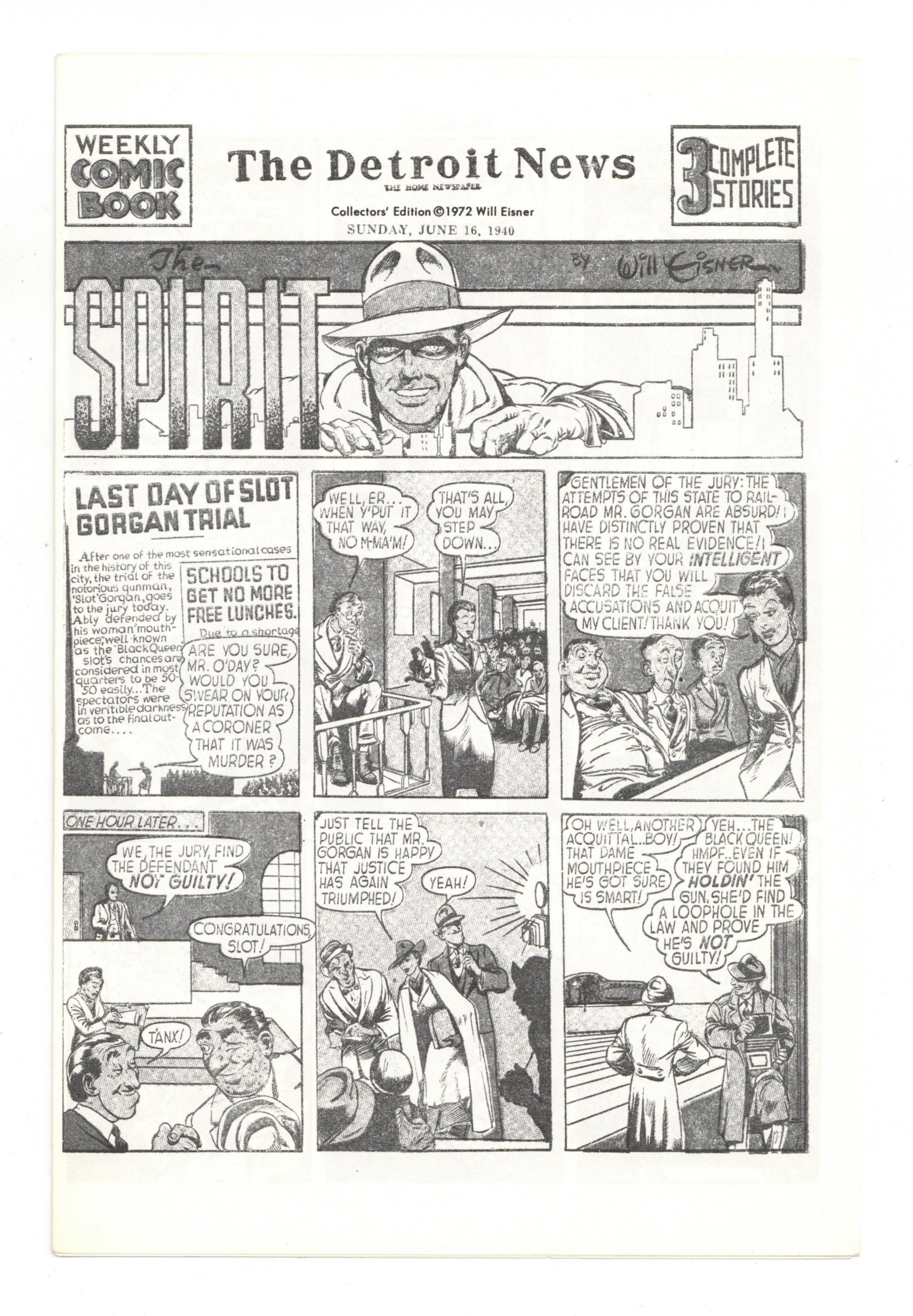 Limited Edition Reprint of the Spirit Weekly Newspaper Comic reprint dated June 16, 1940. Reprints the 3rd issue of Spirit (the following issue June 23, 1940 was not reprinted). Black Queen appearance. Will Eisner wrote individual commentary (on the back page) for most every issue in this reprint series. 6-1/4" x 9 3/8" inches, 8 pages, b&w.